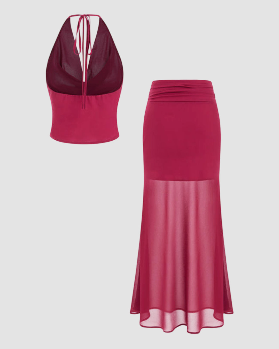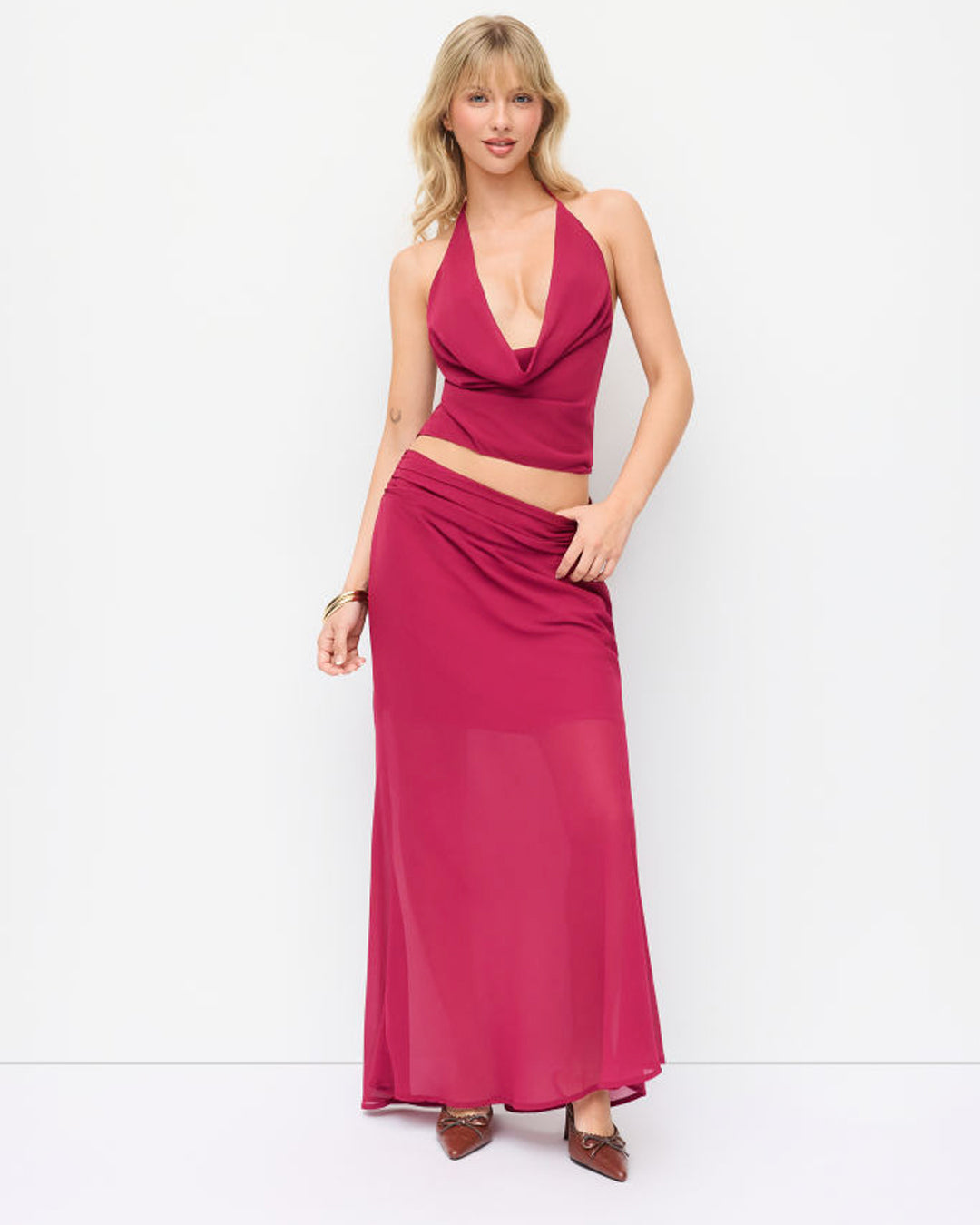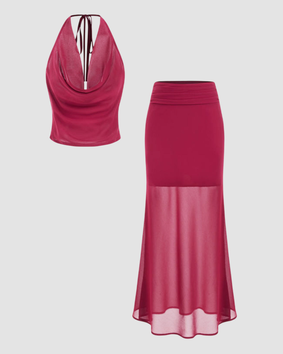 Cowl Neck Crop Top and Low Rise Semi Transparent Maxi Skirt Set in Barbie Pink