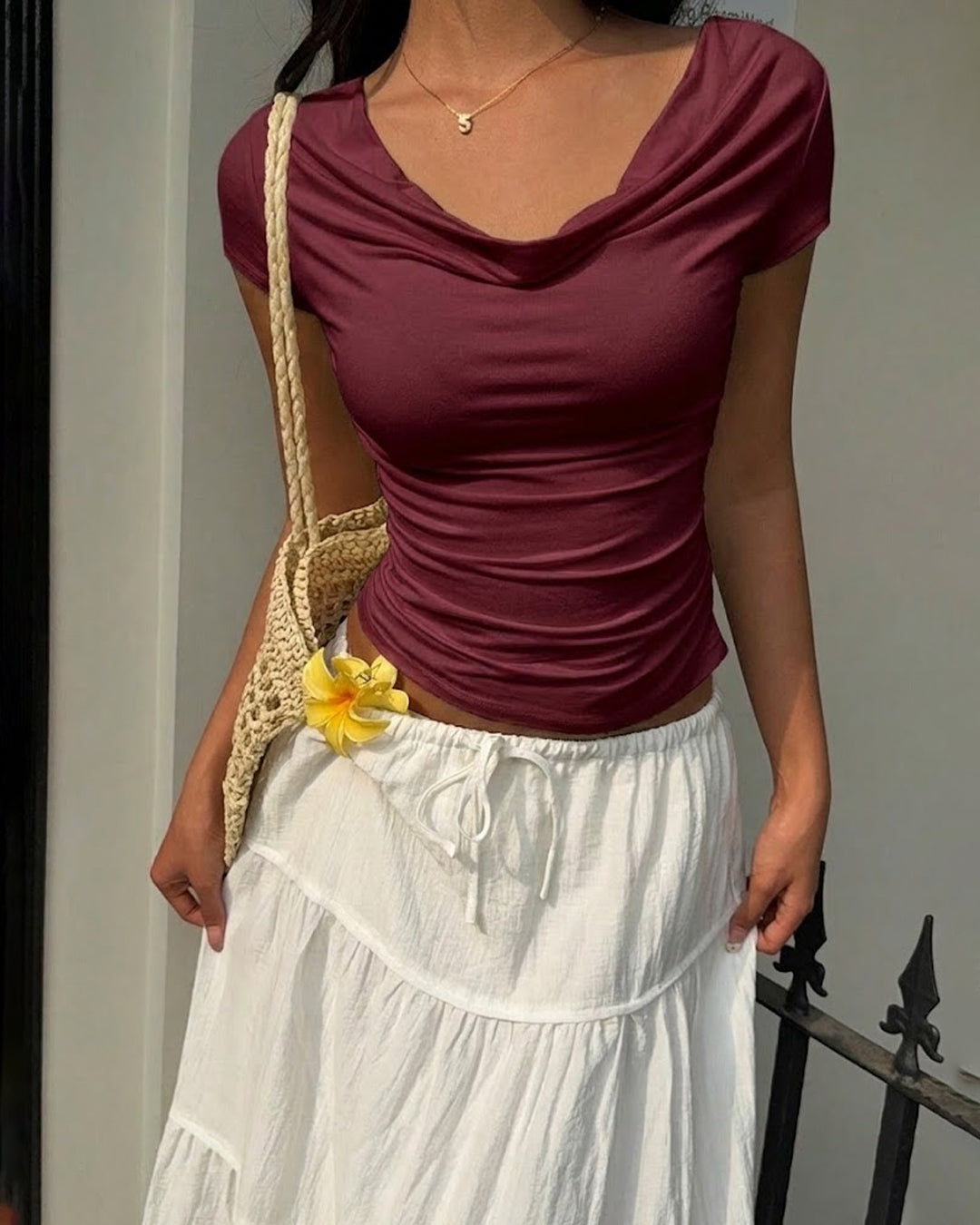 Cowl Neck Short Sleeve Ruffle Fitted Top in Maroon is sleek, feminine, and perfect for effortless everyday styling. This cowl neck fitted top features a softly draped neckline that adds a touch of elegance while highlighting the collarbone. The fitted silhouette gently hugs your shape, creating a flattering and smooth look. Subtle ruffle detailing adds texture and movement, giving this cowl neck fitted top a playful yet polished finish. Designed in a stretch fabric blend, it feels soft, breathable, and comfortable for all day wear. The maroon shade adds a rich and stylish vibe.