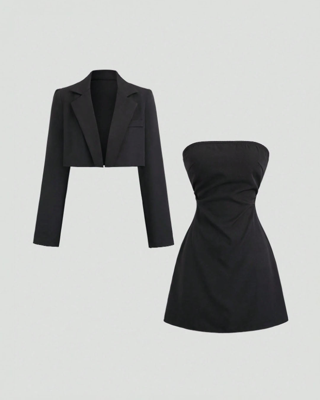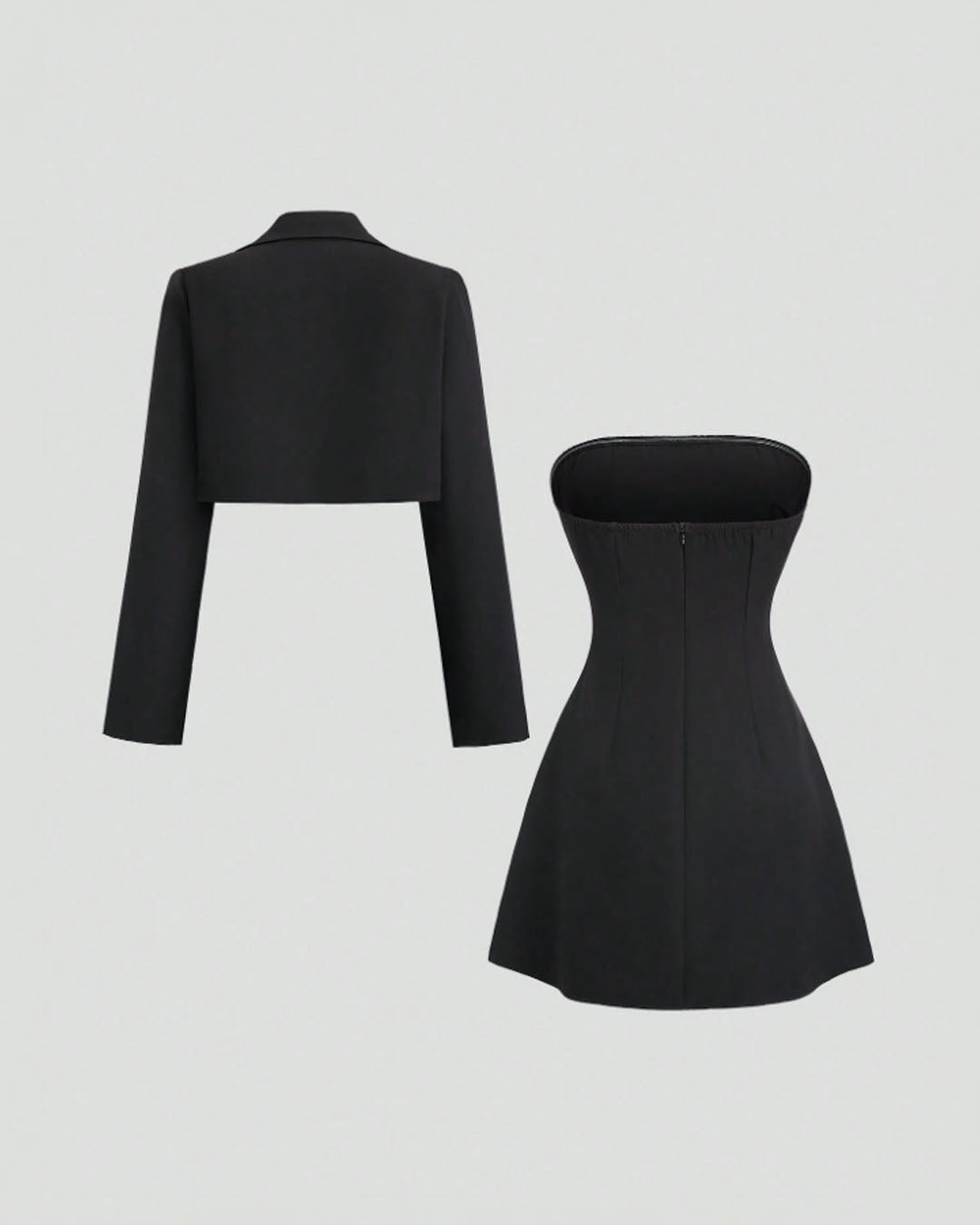This two piece set brings sharp tailoring and soft curves together in the easiest way. The cropped blazer adds a structured edge, while the strapless slim fit dress keeps the look sleek and flattering. Designed to sit close to the body, the dress highlights your shape without feeling restrictive. The blazer balances the silhouette perfectly, giving you a confident, polished vibe that still feels very now. Clean lines and a smooth finish make this set feel modern and elevated without trying too hard.