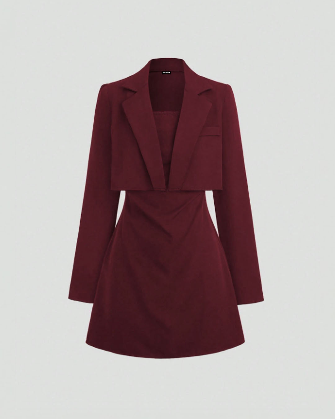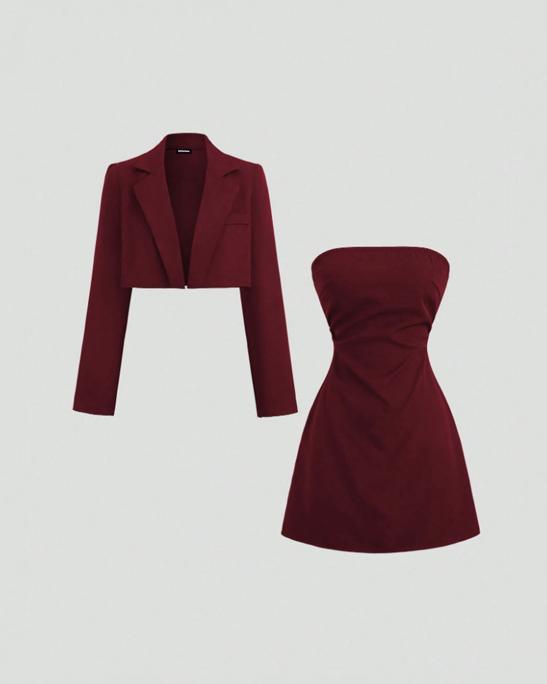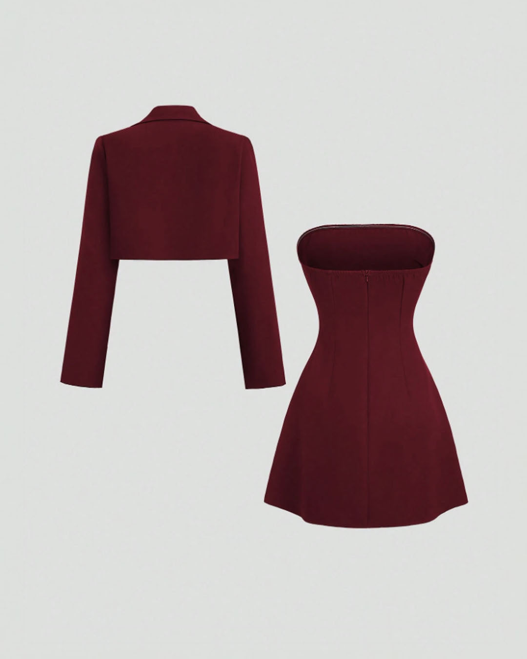 Cropped Blazer Jacket with Strapless Slim Fit Dress Two Piece Set in Merlot