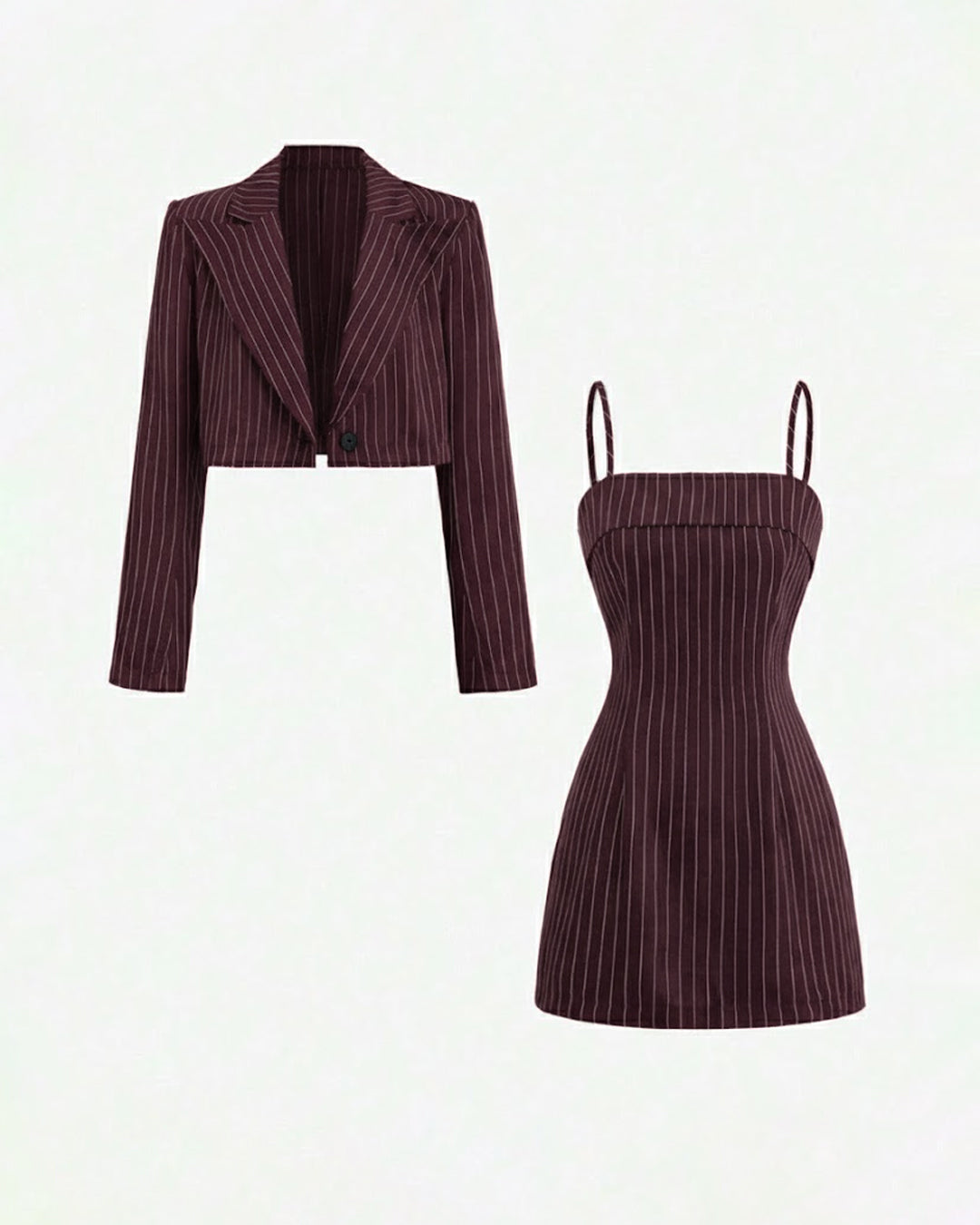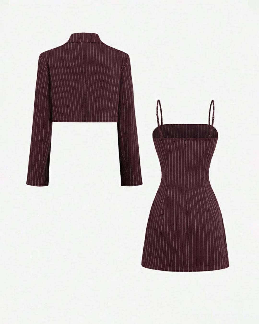 Cropped Pinstripe Blazer and Sleeveless Pinstripe Mini Dress Set in Maroon delivers a bold mix of classic tailoring and modern femininity. The sleeveless mini dress features a sleek, body-contouring silhouette with elegant pinstripes that create a polished, elongated look. Paired with a structured cropped blazer, the set adds a sophisticated layered style that instantly elevates your outfit.