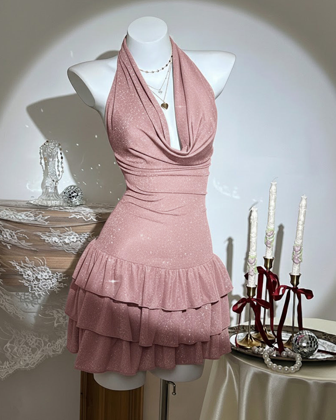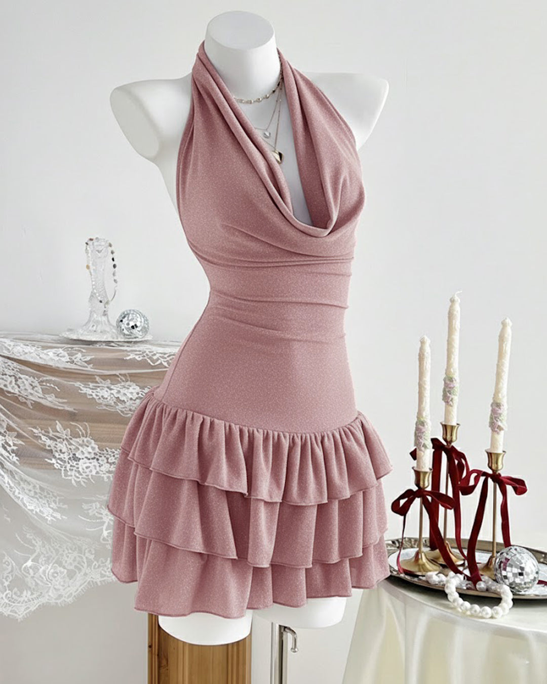 Deep Draped Neck Ruffle Hem Backless Mini Dress in Dusty Pink is flirty, glam, and made for spotlight moments. This backless mini dress features a deep draped neckline that falls softly across the front for a bold yet elegant look. The fitted silhouette hugs your curves, while the layered ruffle hem adds playful movement with every step. Crafted in a nylon and spandex blend, this backless mini dress feels stretchy, smooth, and comfortable for long hours. The pink shade keeps it dreamy and perfect for party nights.