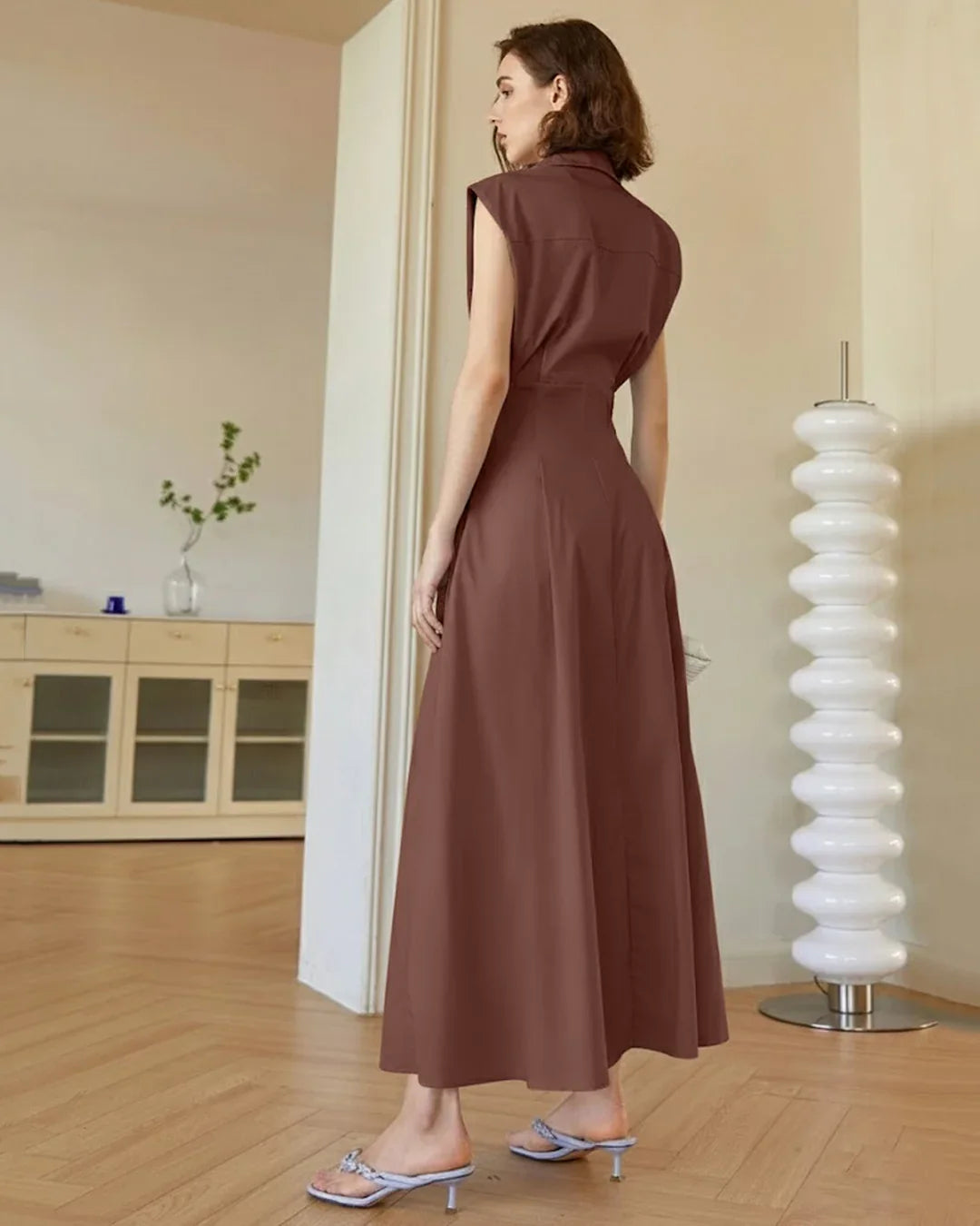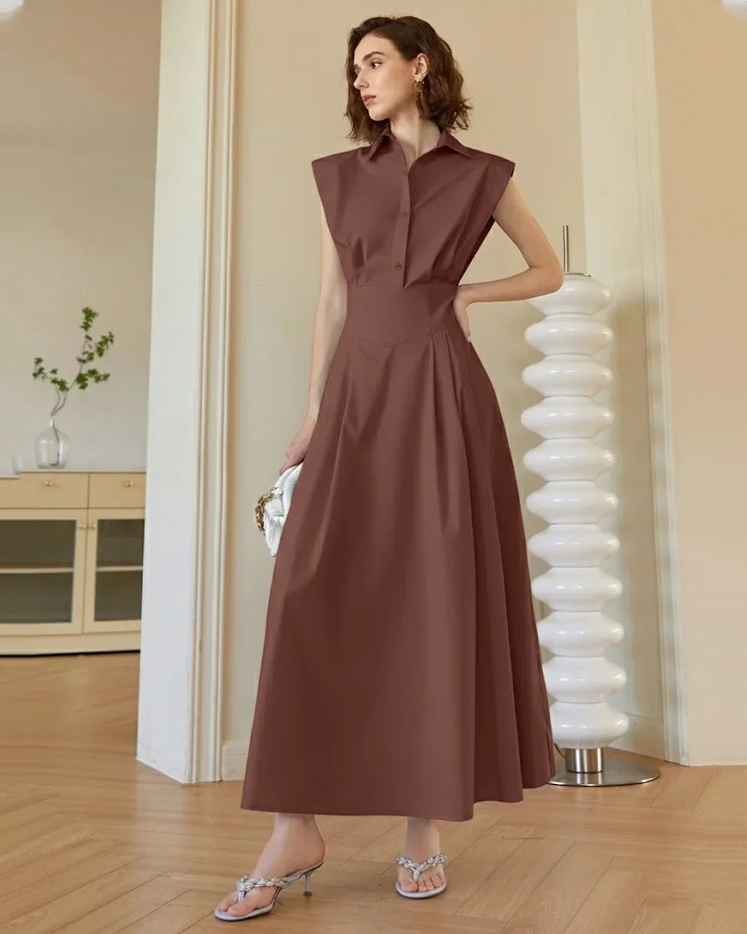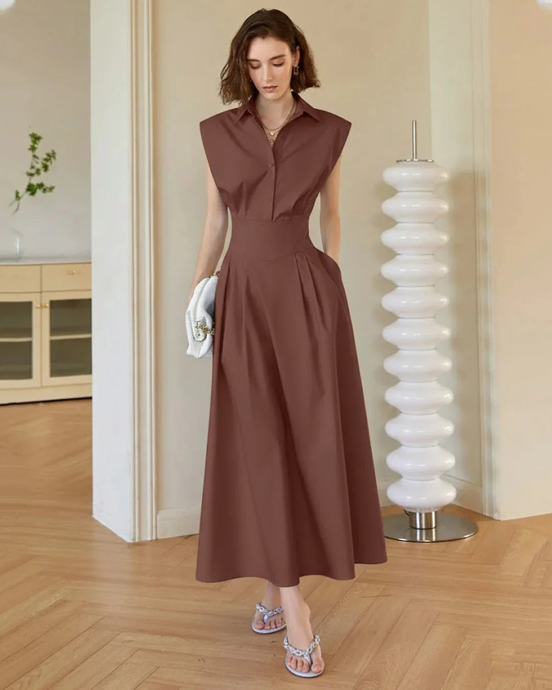 This Maxi Dress in Brown gives a neat and modern look with its collared neckline and smooth sleeveless shape. The fitted waist adds gentle structure while the long flowing fall creates an easy and elegant outline. Made with soft stretch fabric, this Maxi Dress in Brown feels light, comfortable and polished for all day plans.