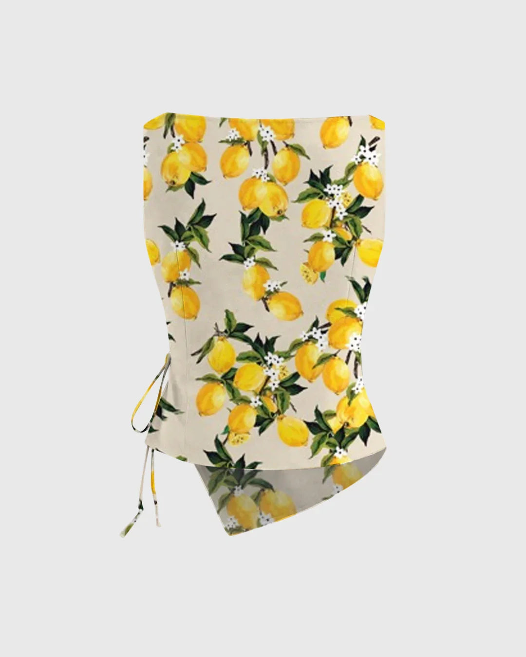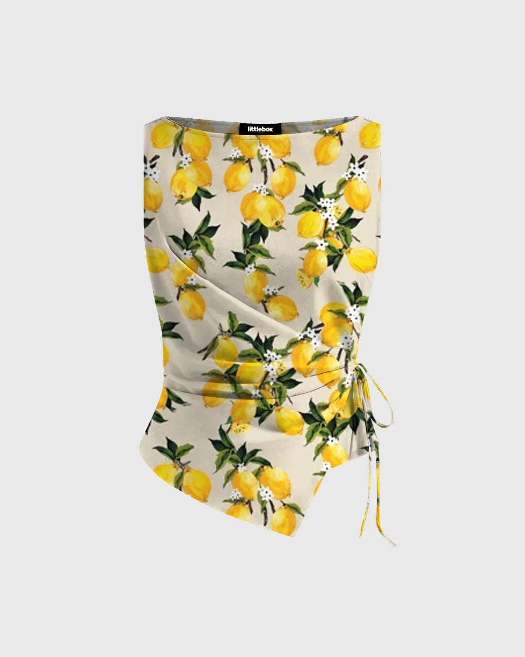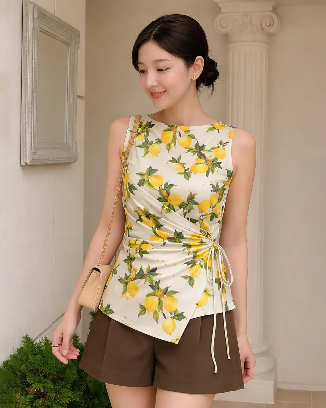 Floral Asymmetrical Ruched Side Tie Sleeveless Top in Yellow