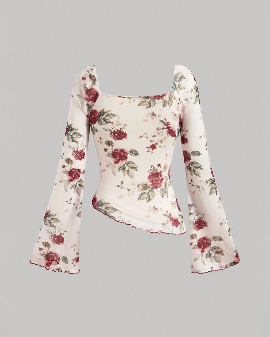 Floral Bowknot Tie Asymmetrical Hem Bell Sleeve Top