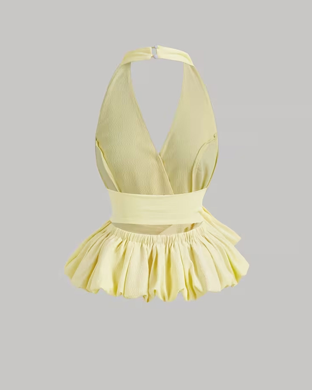 This halter neck top brings playful volume and a flattering silhouette together in one statement piece. Designed with a deep V halter neckline, it beautifully frames the shoulders and collarbone while offering a secure back fastening for a clean finish.