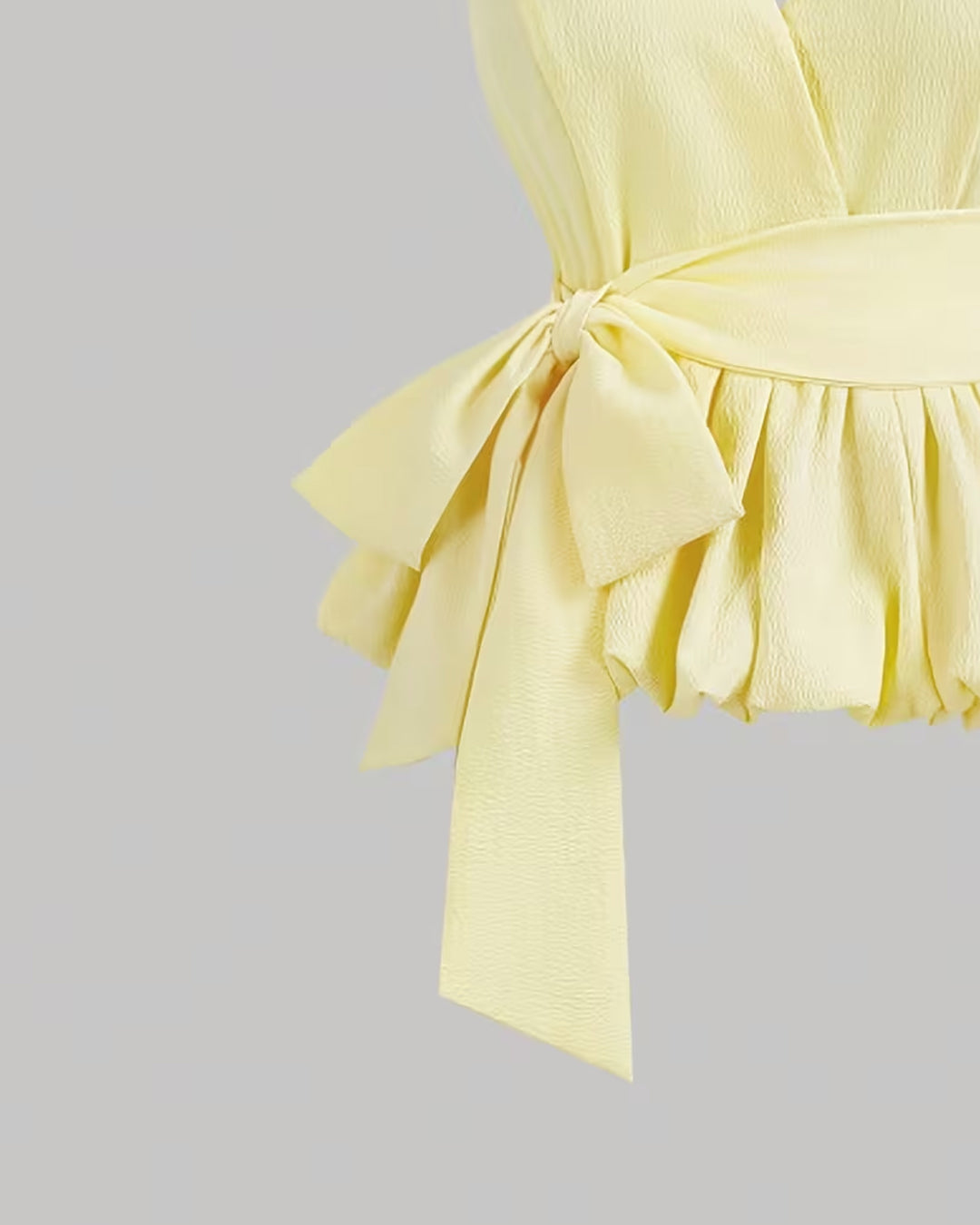 The fitted waistband cinches the waist and highlights your shape, flowing into a soft ruffled hem that adds movement and charm. A side tie detail enhances the feminine look, creating a subtle wrap effect that feels stylish yet effortless. The textured polyester jute staple fabric gives the top structure while keeping it lightweight and comfortable.