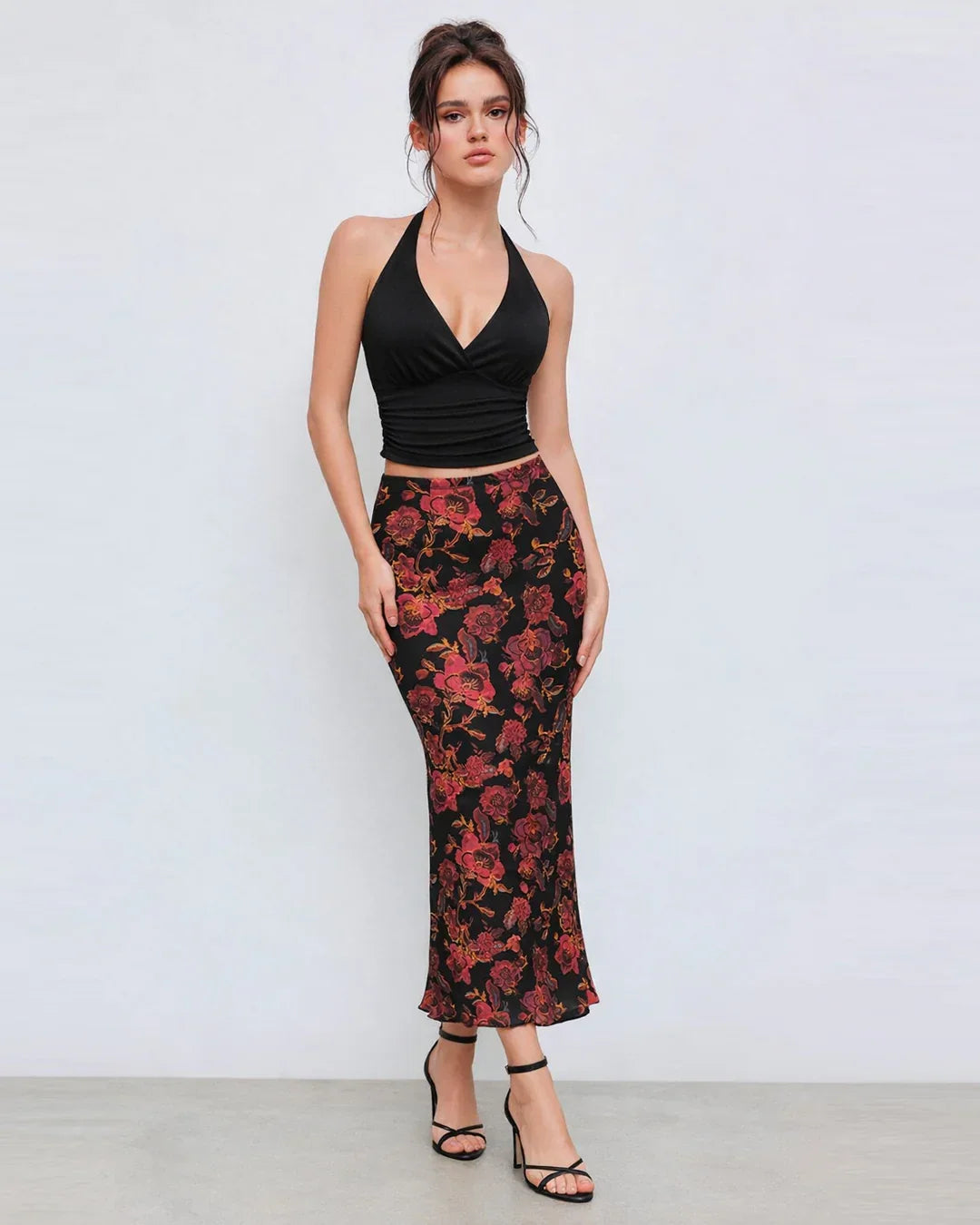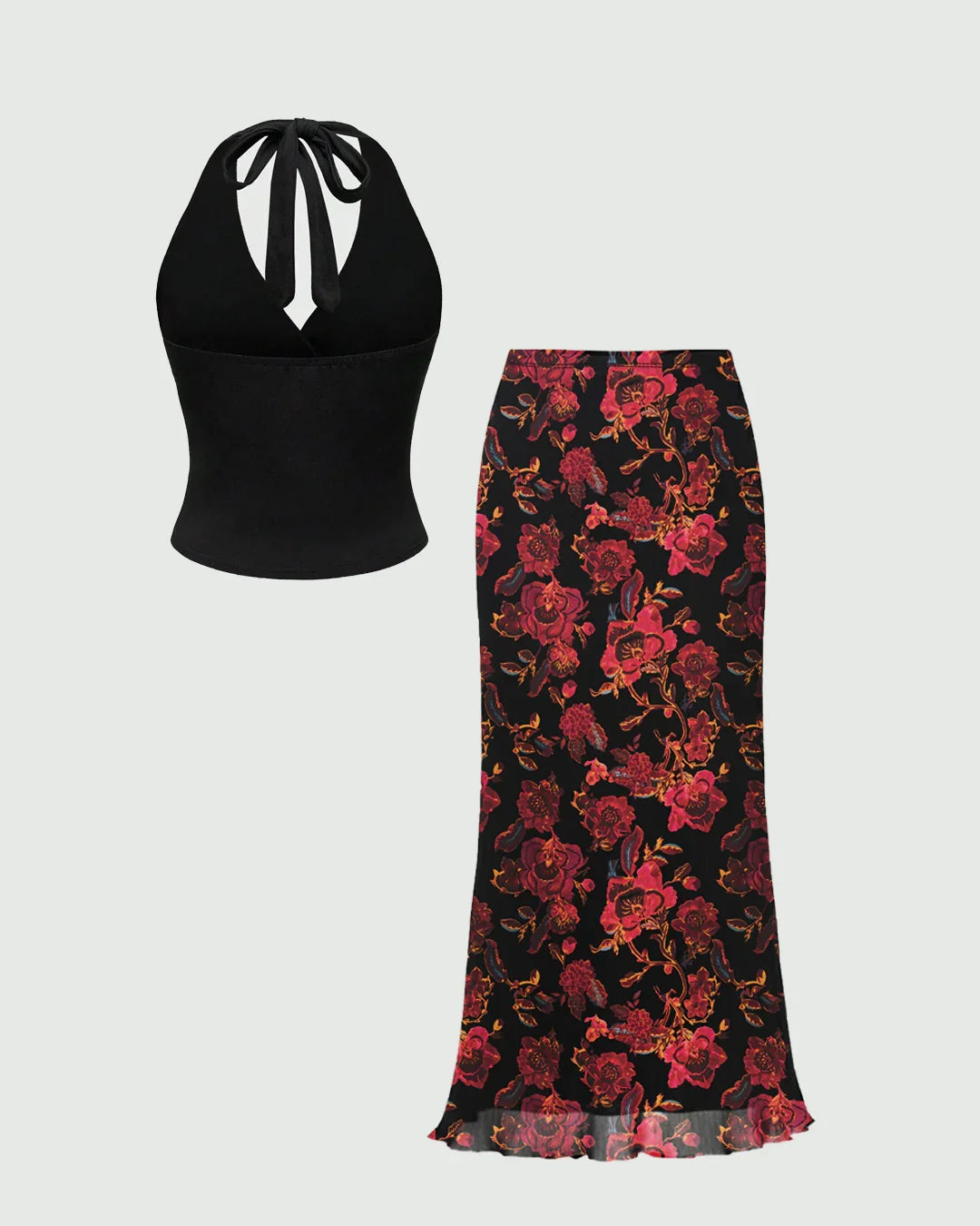 Whether you are heading to a dinner, party, or special event, this halter neck slim fit flounce hem top and floral print sleeveless maxi skirt gives you a confident and polished look without trying too hard.