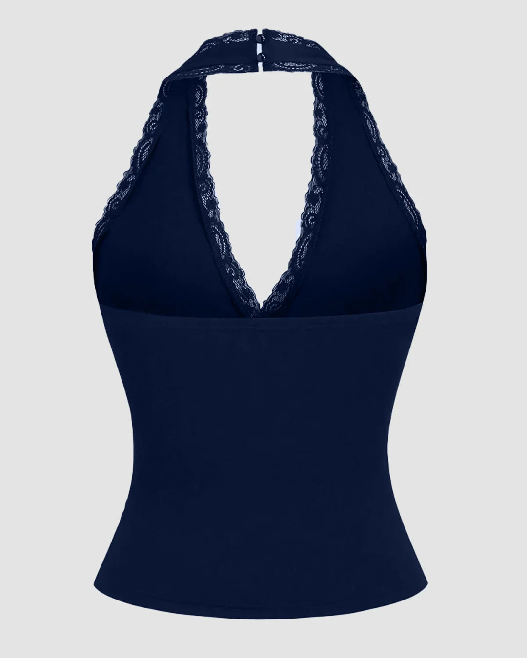 Halter Neck Slim Fit Straight Hem Contrast Lace Backless Sleeveless Top in Navy Blue