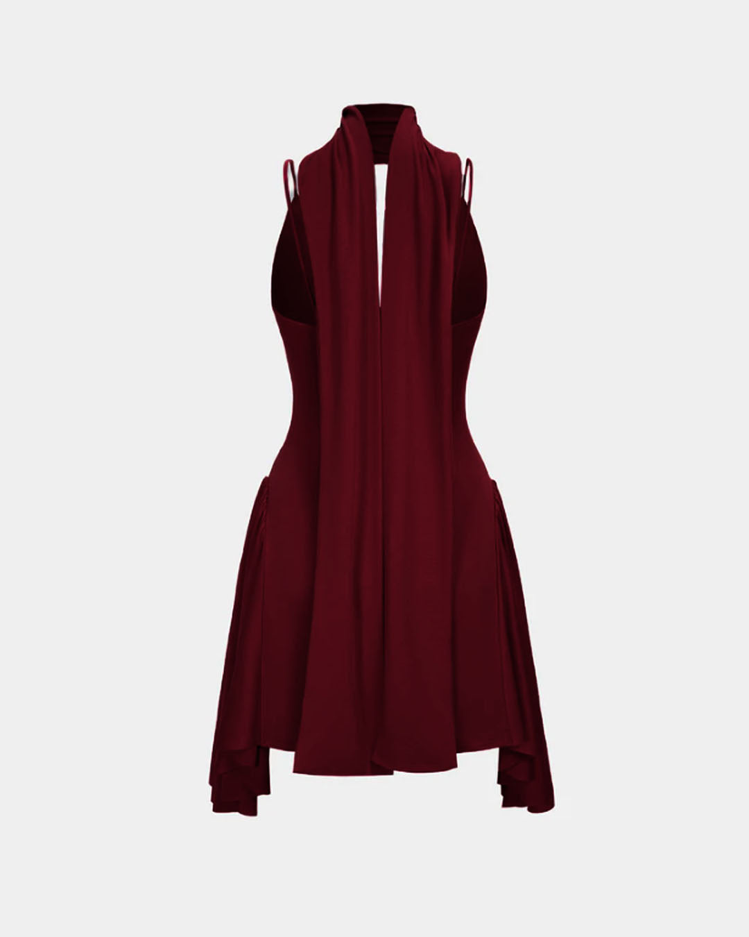Halter Neck V-Neck Slip Sleeveless Mini Dress is all about clean lines and confident energy. Designed with a sleek halter neckline and a soft V-neck cut, this mini dress highlights the shoulders while keeping the silhouette smooth and flattering. The slip-style fit hugs the body comfortably without feeling tight, and the lightweight fabric moves easily with you. The rich merlot tone adds a subtle luxe vibe, making it feel polished yet playful at the same time.