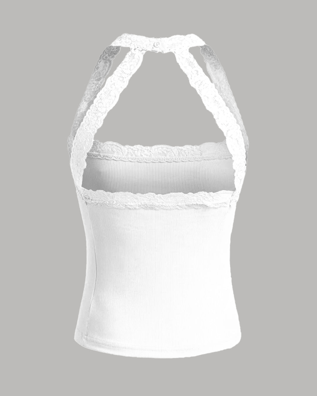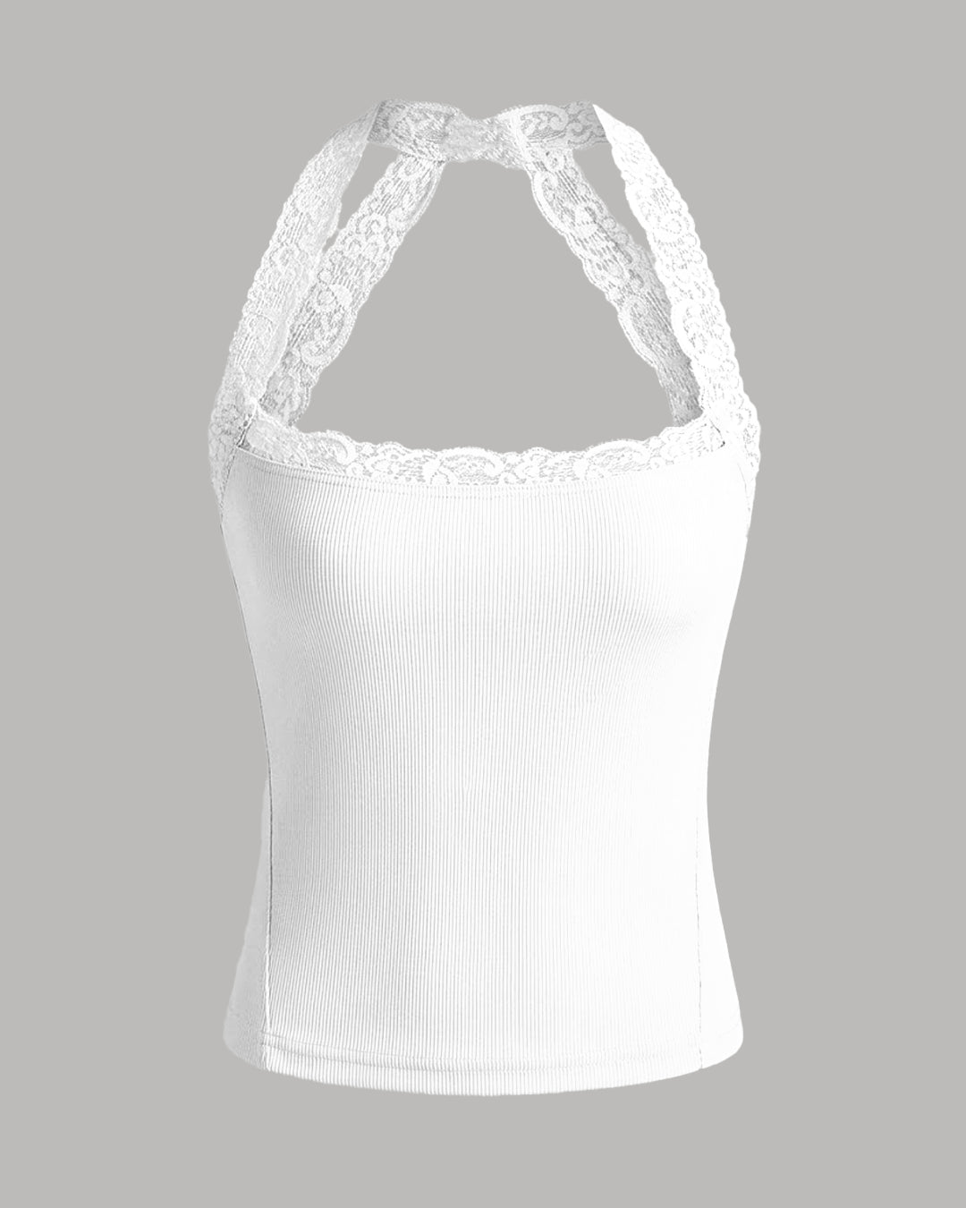 Halter Neckline Lace Trim Tank Top in White is soft, feminine, and made to stand out. The halter neckline frames the shoulders beautifully, while the delicate lace trim adds a subtle romantic touch. Designed in a flattering fitted shape, this lace trim tank top hugs comfortably and enhances your silhouette. The stretch blend fabric feels smooth on the skin and moves easily with you. Clean lines and a crisp white tone keep this lace trim tank top looking fresh and versatile. With its sleek cut and lace detail, this lace trim tank top balances minimal style with statement energy.