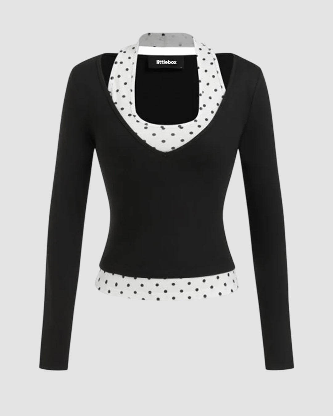 Halter Neckline Polka Dot Top & V Neck Long Sleeve Top is a layered statement piece that blends playful detail with a clean, fitted silhouette. Designed with a contrast polka dot halter neckline layered under a sleek V-neck long sleeve top, this style adds instant depth to your look without extra effort. The slim fit hugs just right, while the smooth fabric keeps the finish neat and polished. Halter Neckline Polka Dot Top & V Neck Long Sleeve Top feels modern, slightly retro, and totally on-trend for everyday wear.