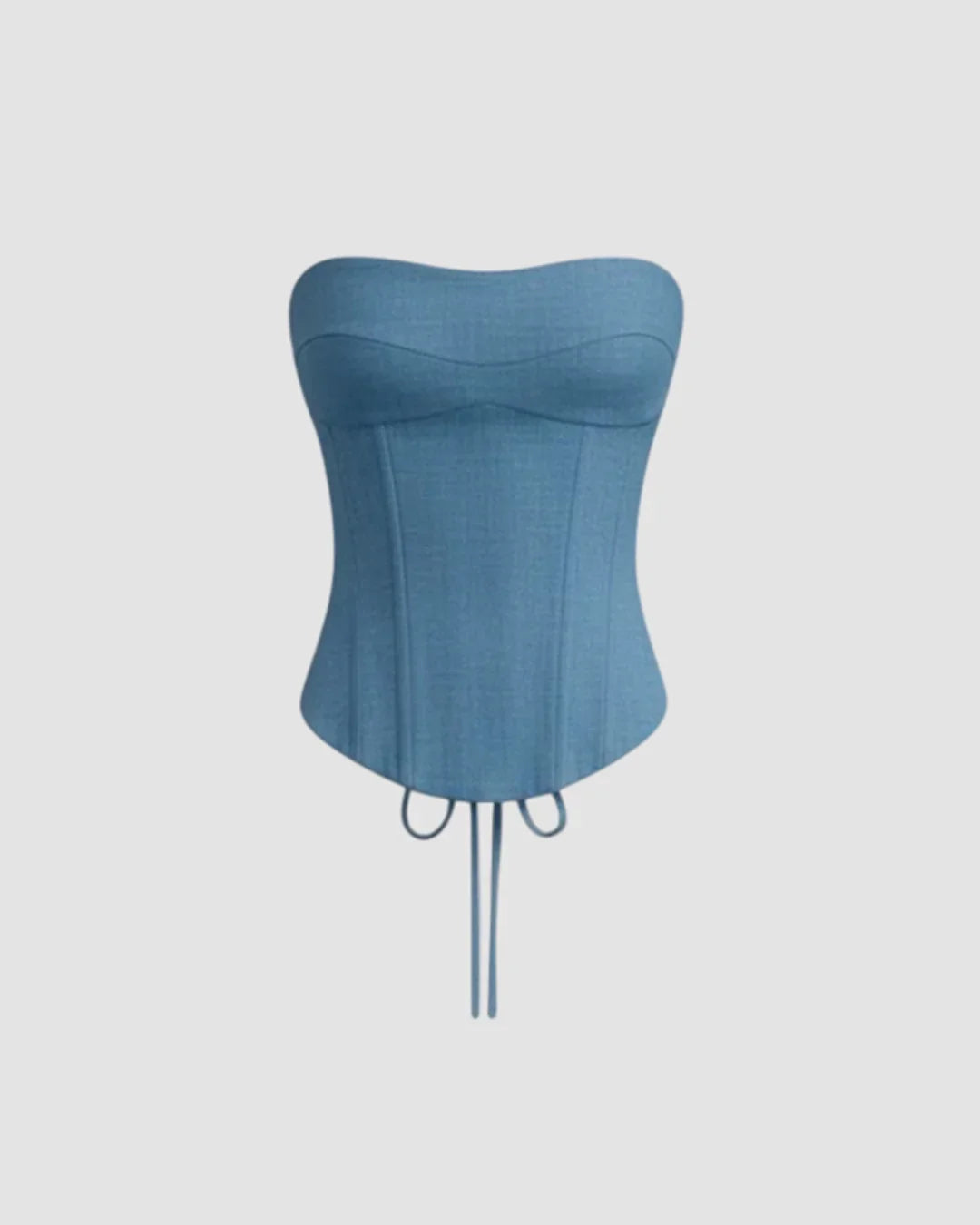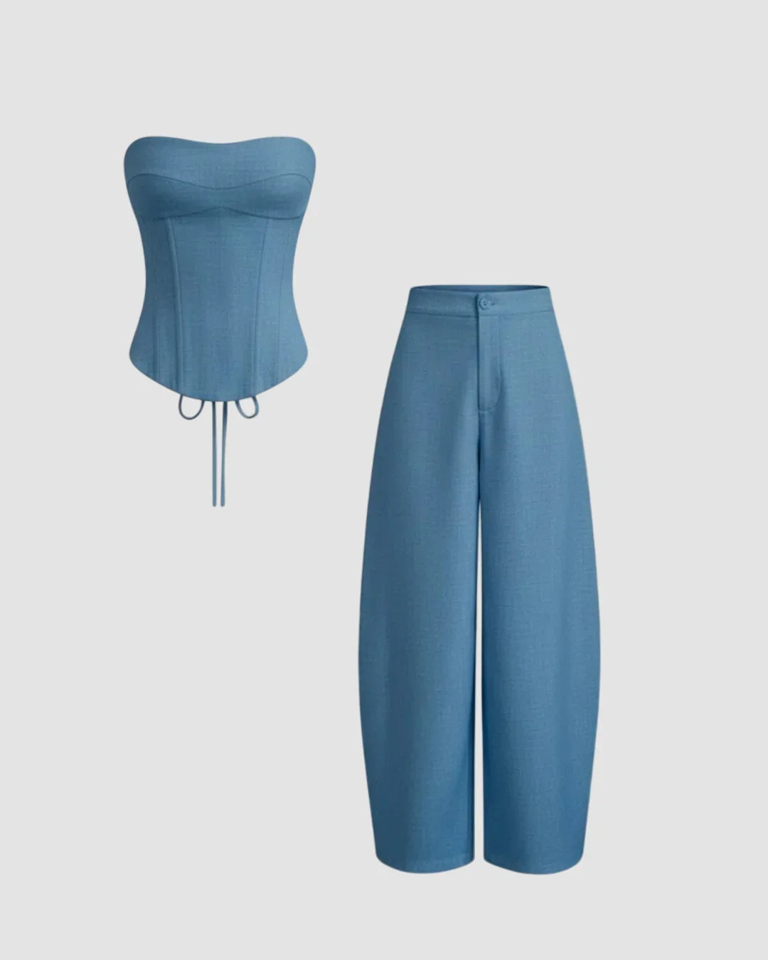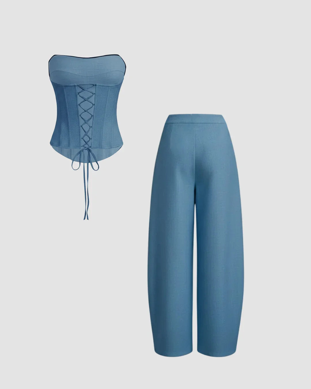 Lace Up Corset Bandeau Top & Mid Rise Barrel-leg Trousers Set in Dark Blue