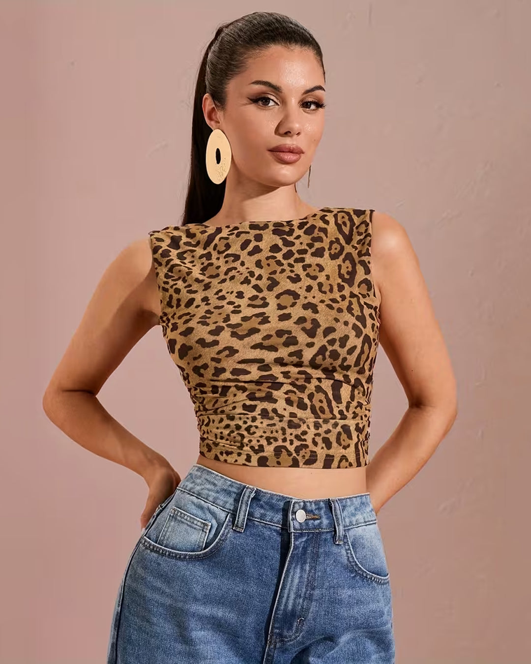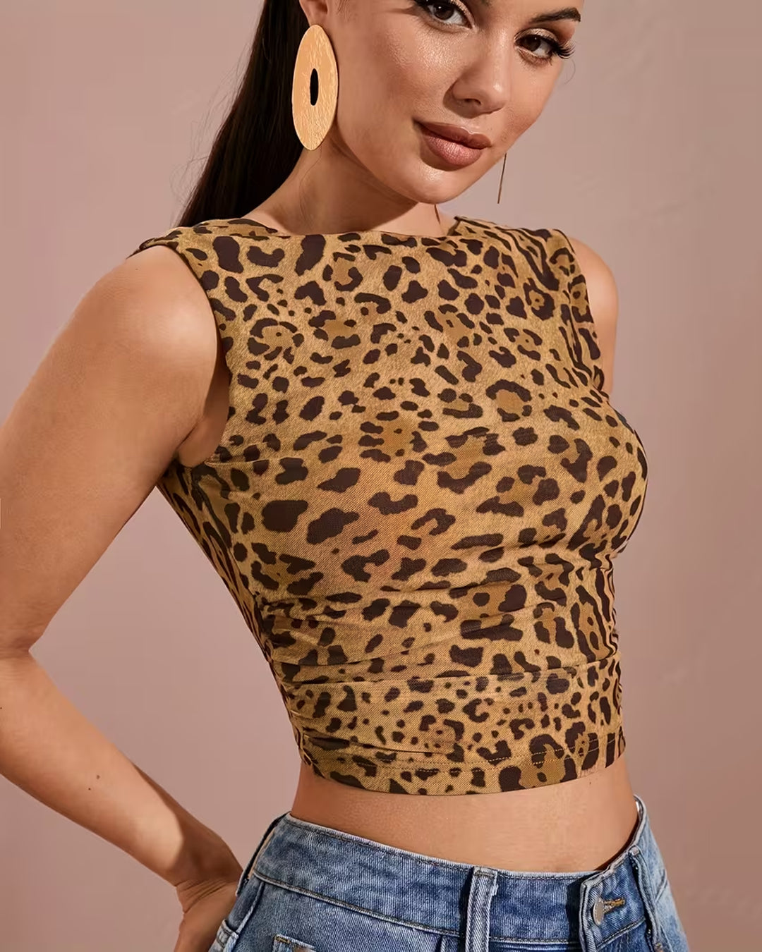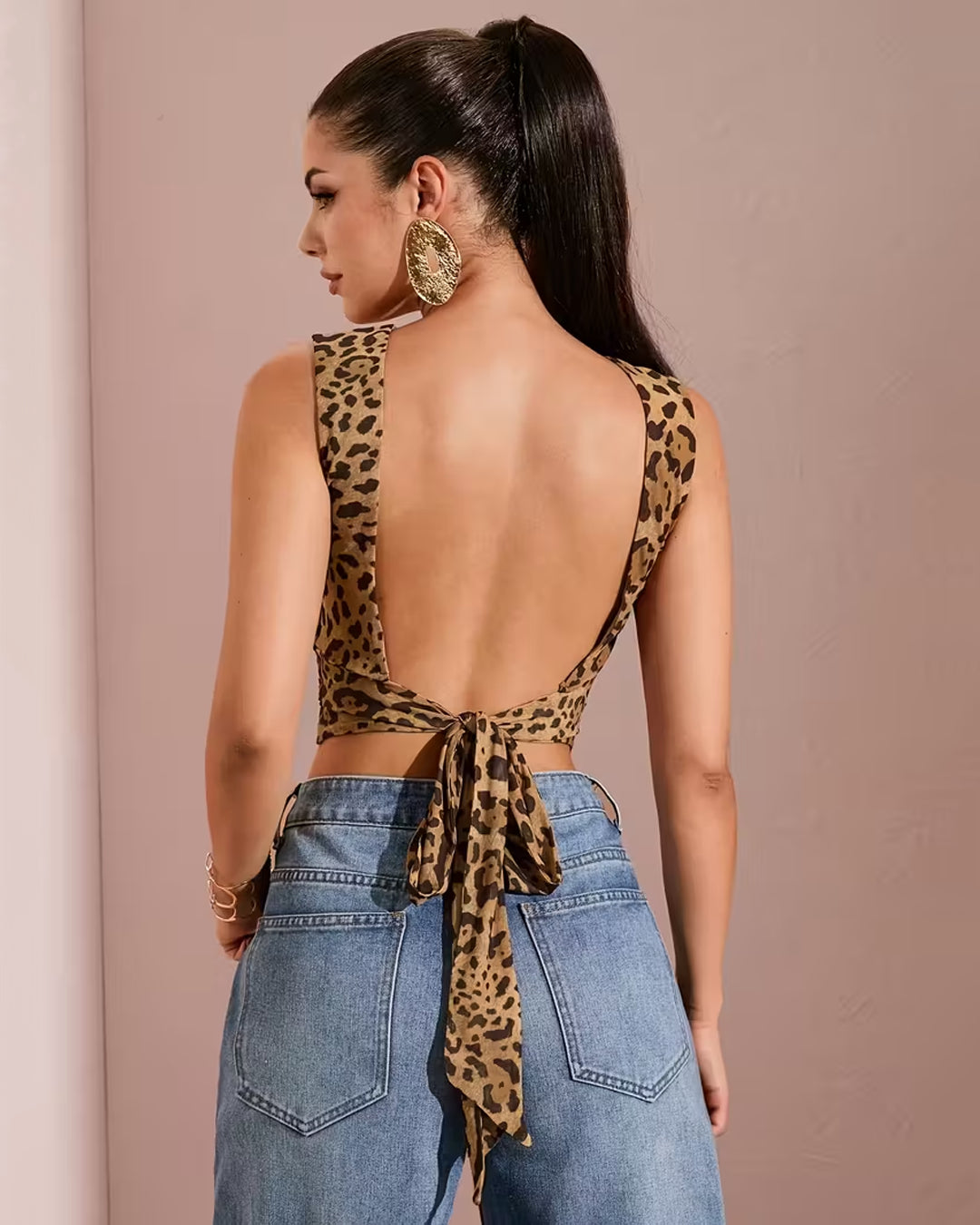 Leopard Print Round Neck Sleeveless Backless Tie-Up Crop Top