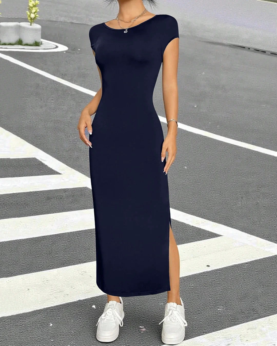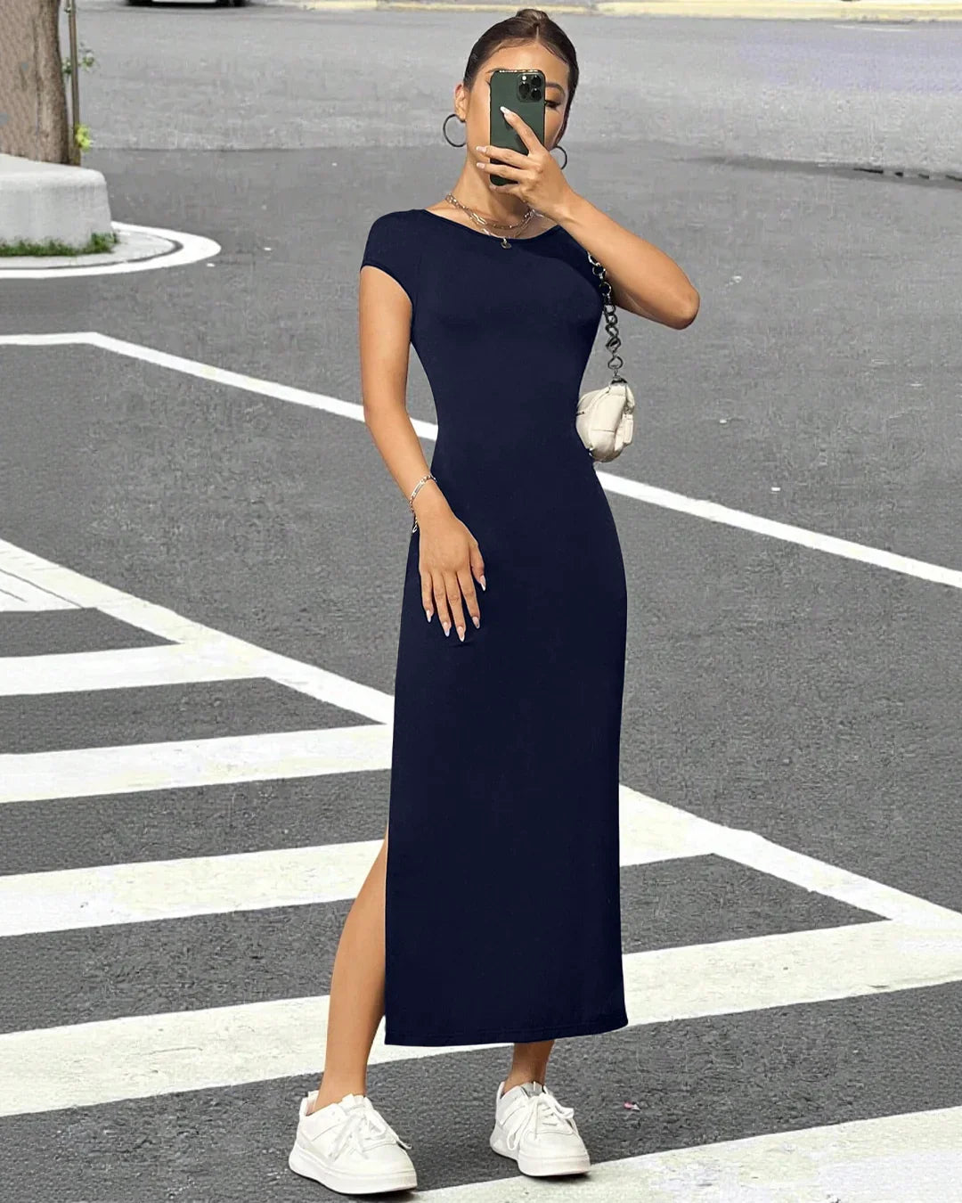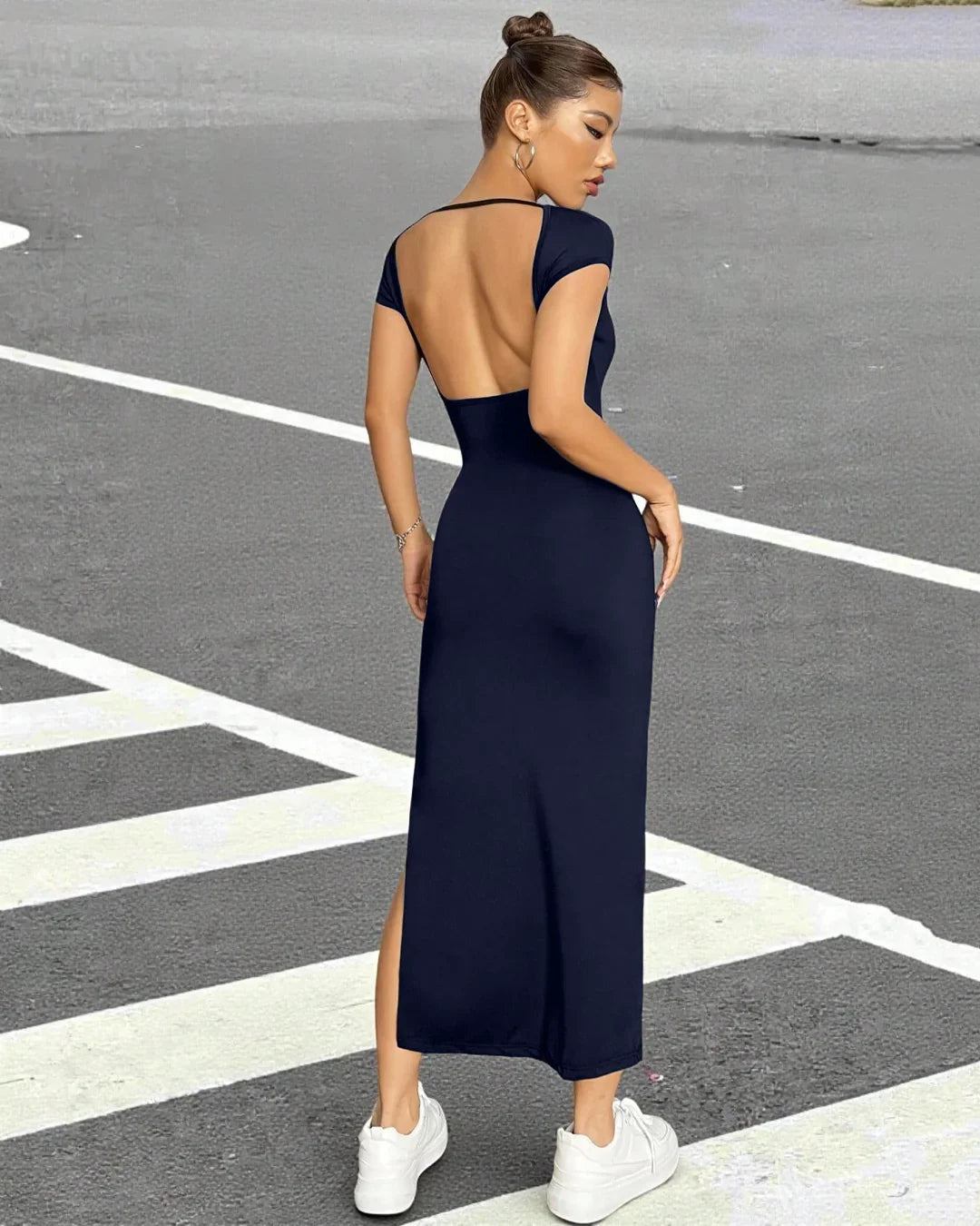 Perfect for parties, dinner dates, or late night plans with your girls. It feels snug yet comfy, so you can dance, walk, and pose without stress. Pair it with sneakers for a cool casual look or heels for full glam. The Navy Blue Solid Split Thigh Backless Bodycon Y2k Dress is your go to when you want effortless but unforgettable style.