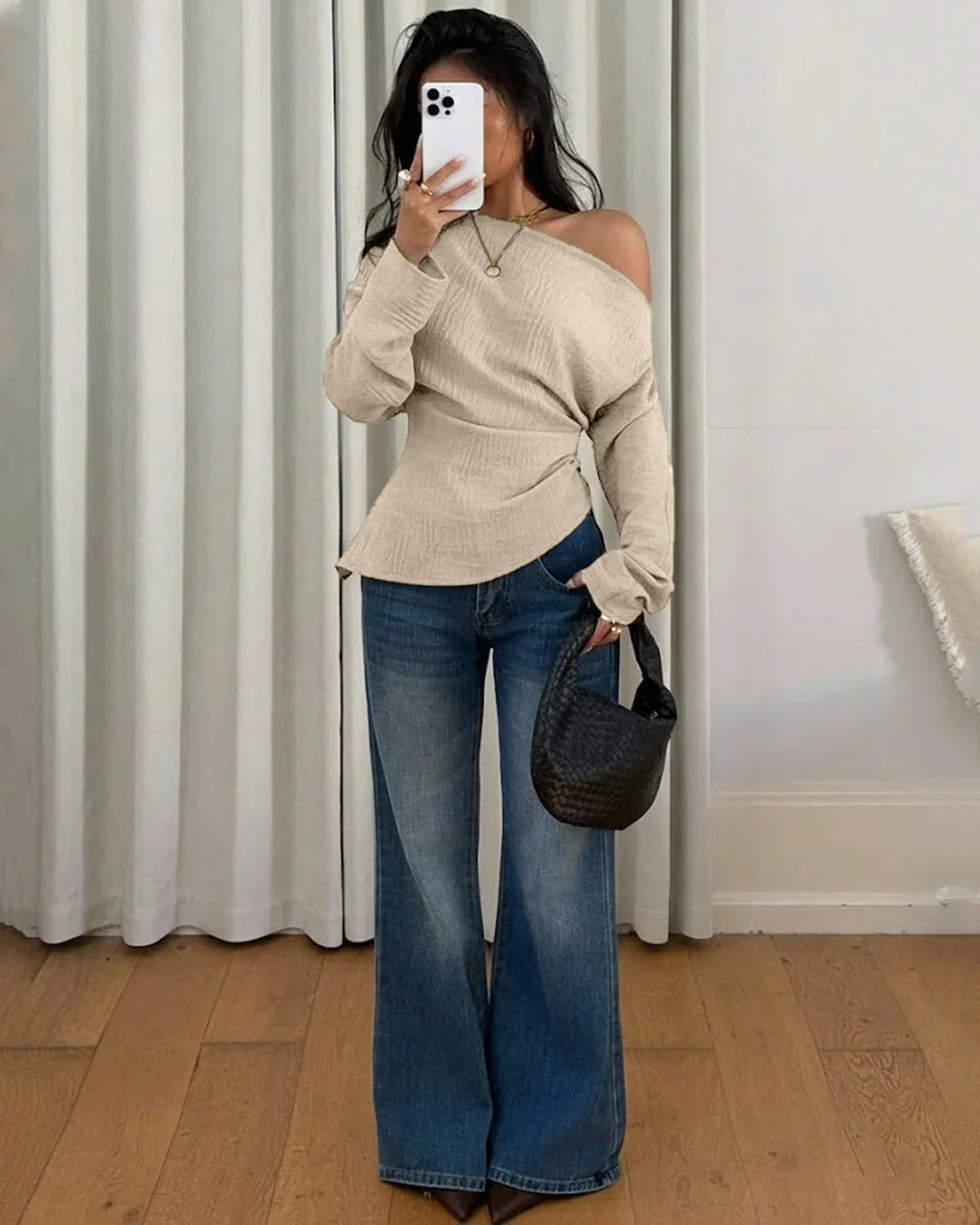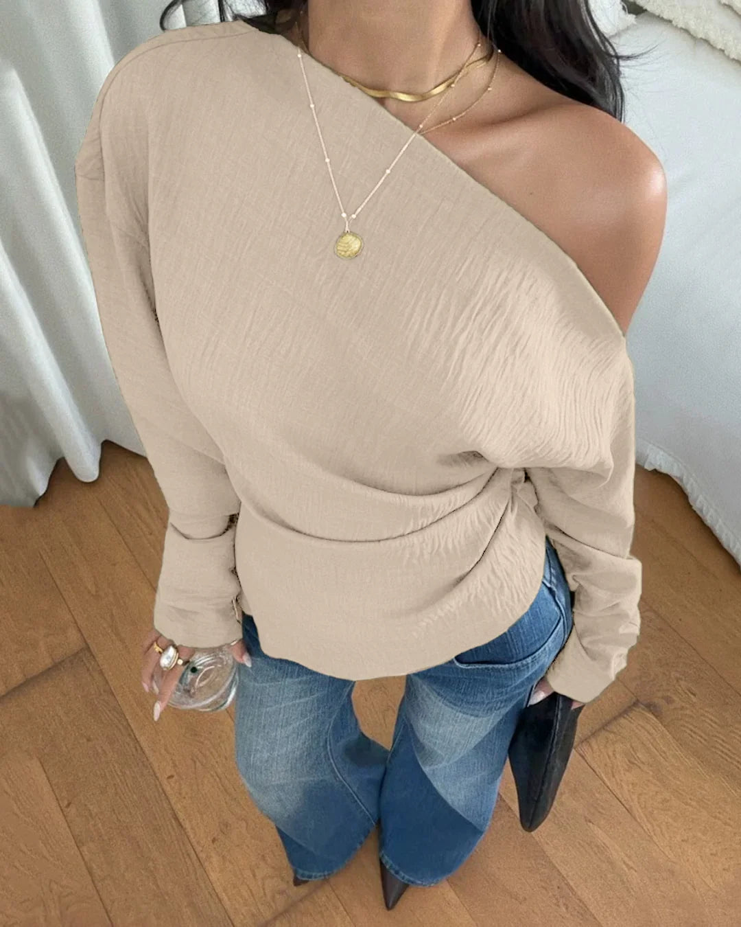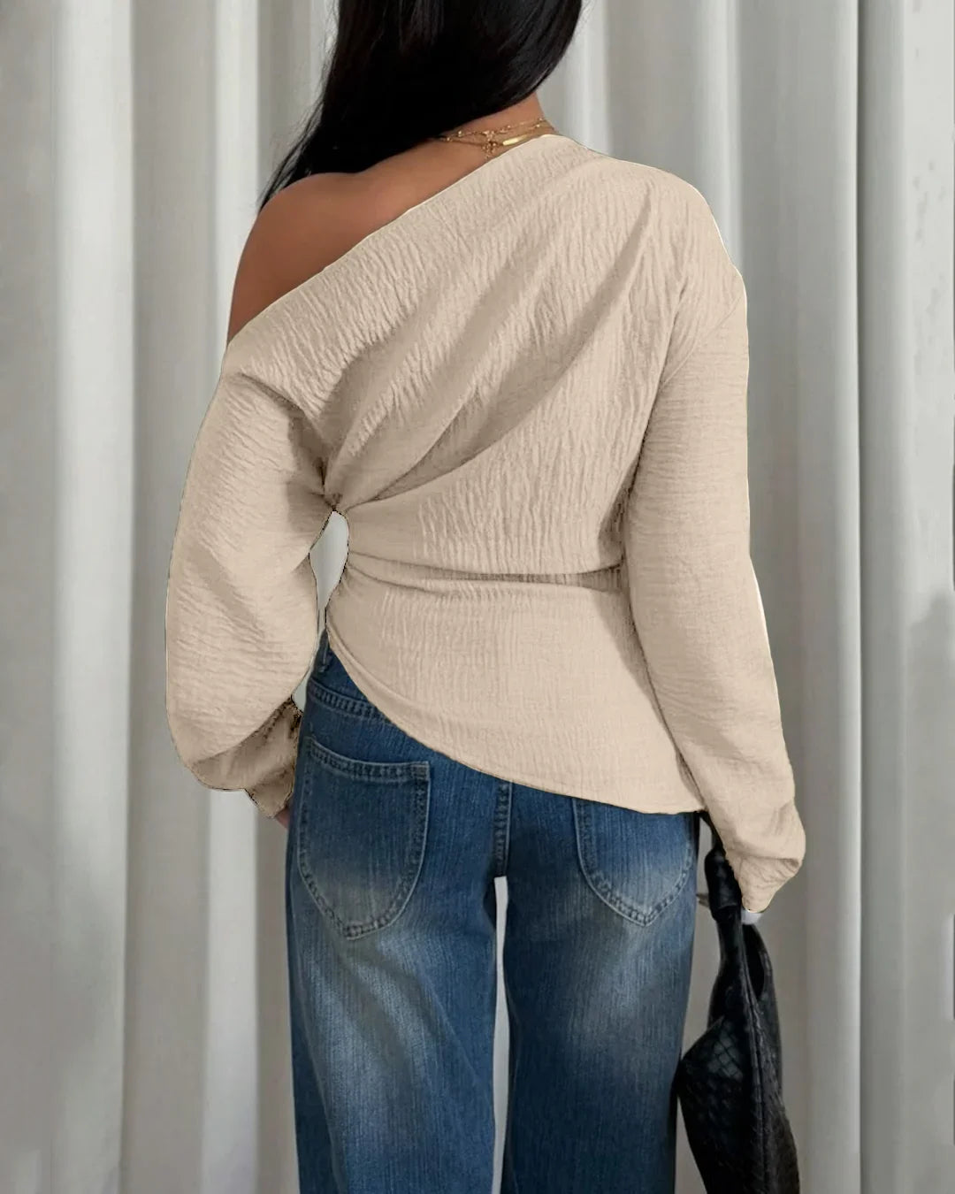 Made from smooth polyester fabric, this Asymmetrical Neck Top in Beige feels lightweight and easy to wear throughout the day. The relaxed fit makes it perfect for casual outings, brunch plans, or laid-back evenings when you want to look put together without trying too hard.