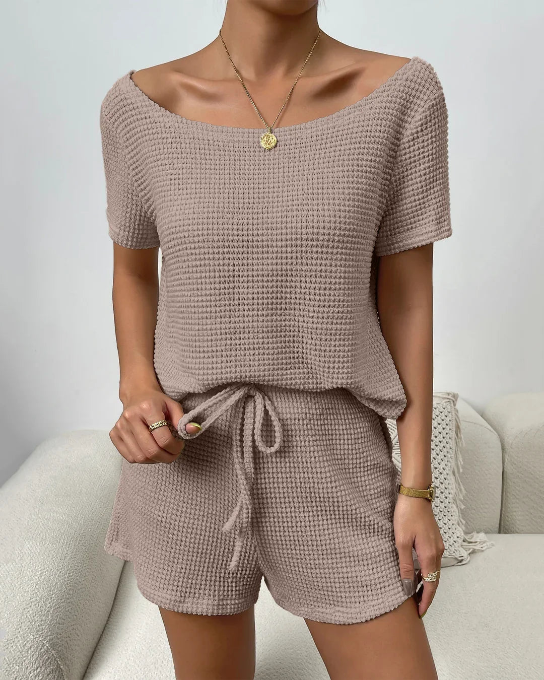 Off-Shoulder straight Hem Solid Short Sleeve Top and Drawstring Waist Shorts in camel