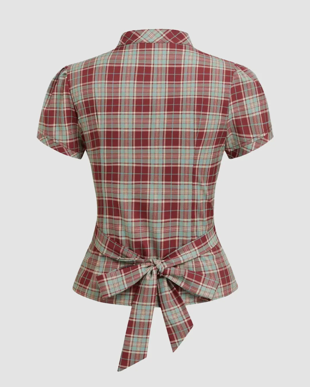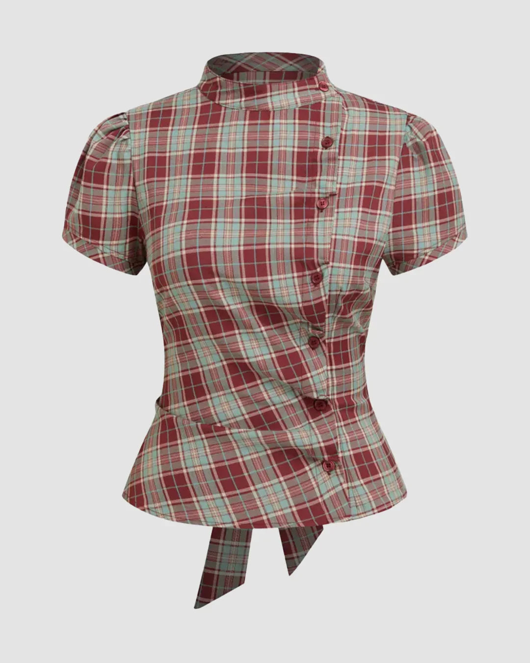 Plaid Stand Collar Puff Sleeve Tie Back Button Top