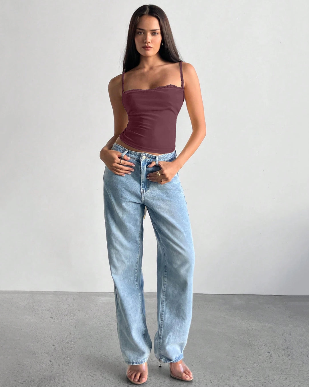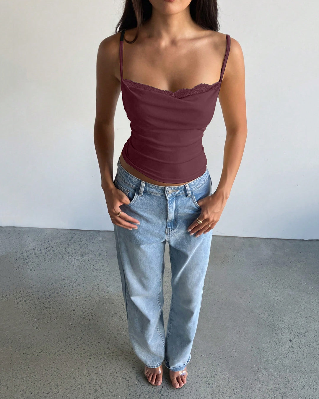 Plunge Neck Lace Trim Bow Knot Strap Top in Maroon is soft, feminine, and effortlessly chic. This lace trim top features a flattering plunge neckline with delicate lace detailing along the bust for a romantic finish. The slim straps and fitted silhouette create a clean, minimal shape, while the bow knot detail adds a subtle playful touch. Crafted in a polyester, lycra, and crepe blend, this lace trim top feels smooth with a gentle stretch that hugs your body comfortably. The rich maroon shade gives it a bold yet elegant vibe.