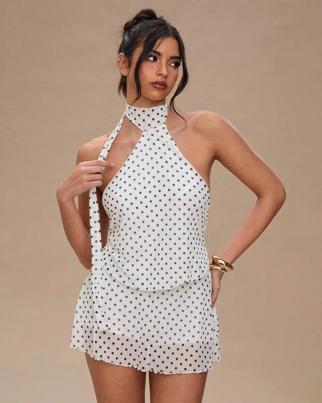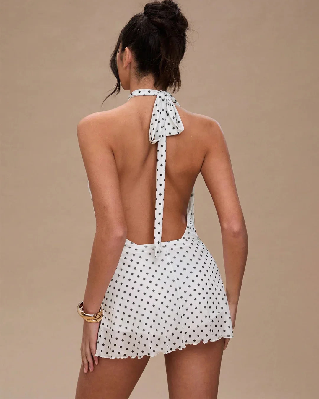 Designed in lightweight polyester, this polka dot printed halter mini dress feels smooth against the skin and holds its shape effortlessly. The timeless polka dot pattern adds a vintage-inspired touch, while the mini cut keeps the look fresh and youthful. Whether you're heading out for brunch, a casual day out, or a dinner plan, this polka dot printed halter mini dress brings easy charm to your wardrobe.