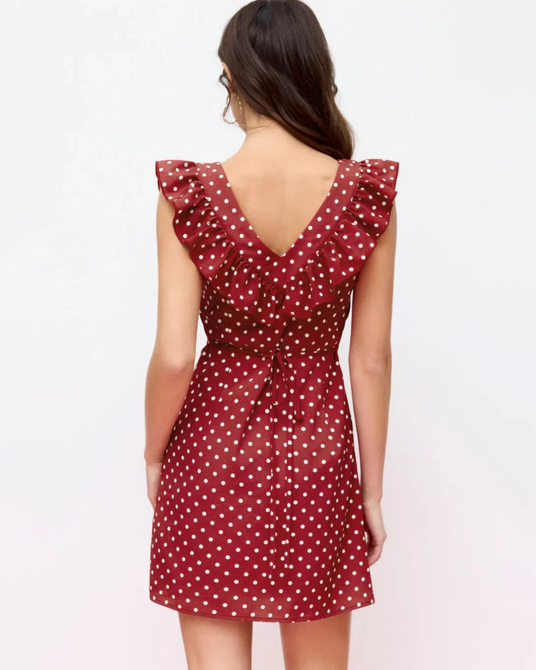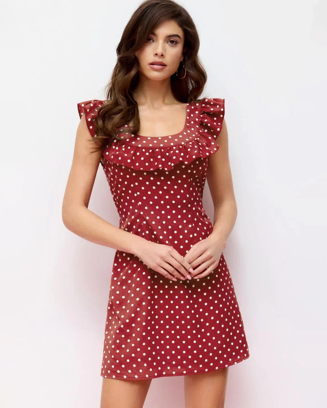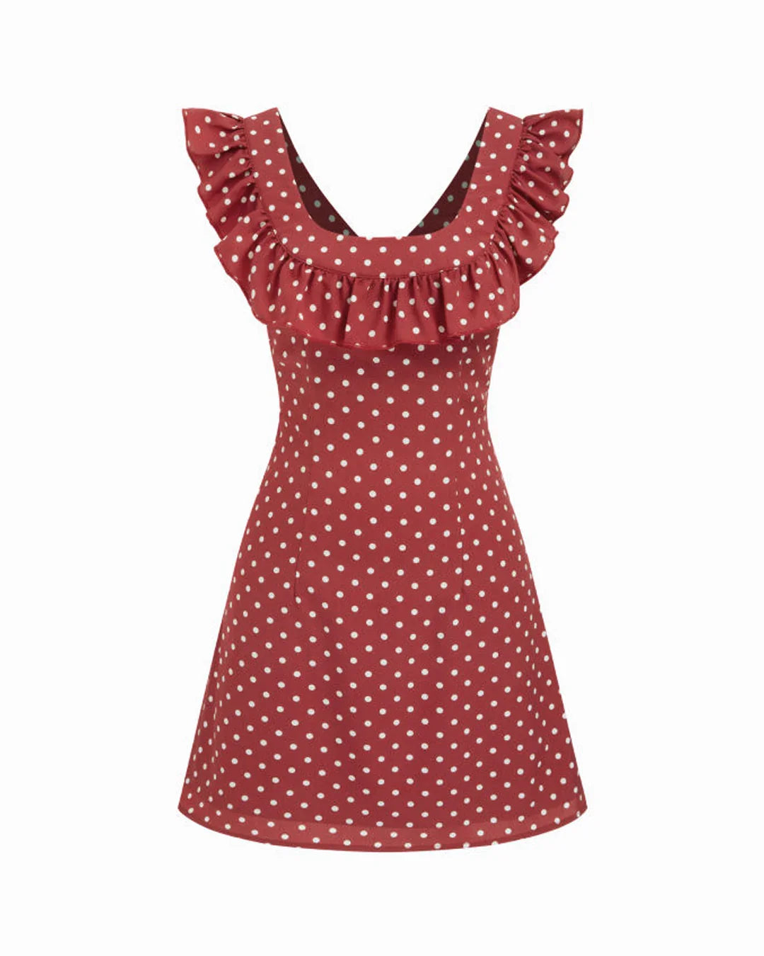 Polka Dot U-neckline Ruffled A-line Mini Dress brings a playful, vintage-inspired vibe with a fresh Gen-Z twist. This polka dot mini dress features a flattering U-neckline framed with soft ruffles that add movement and charm. The A-line silhouette sits easy on the body, giving a relaxed yet put-together look that feels light and effortless. Crafted in smooth polyester, this polka dot mini dress drapes well and keeps its shape, making it perfect for days when you want something cute but uncomplicated. The red base with classic polka dots keeps the mood bold, fun, and timeless.