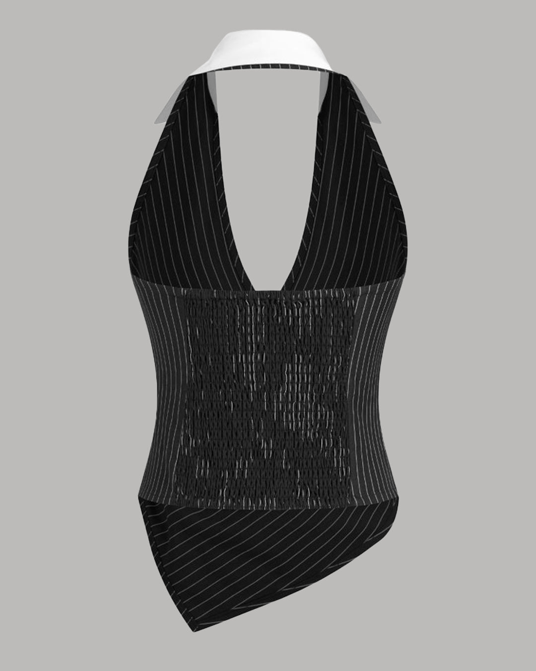 This polo neck stripe top gives classic stripes a bold, modern twist. The deep neckline with a structured polo collar adds sharp detail, while the ruched and shirred waist creates a flattering, sculpted fit. The asymmetrical hem keeps this polo neck stripe top looking fresh and fashion forward. Designed in black with clean stripe lines, it blends smart and edgy in one easy piece. The fabric feels smooth on the skin and holds its shape, making this polo neck stripe top a standout for everyday styling.