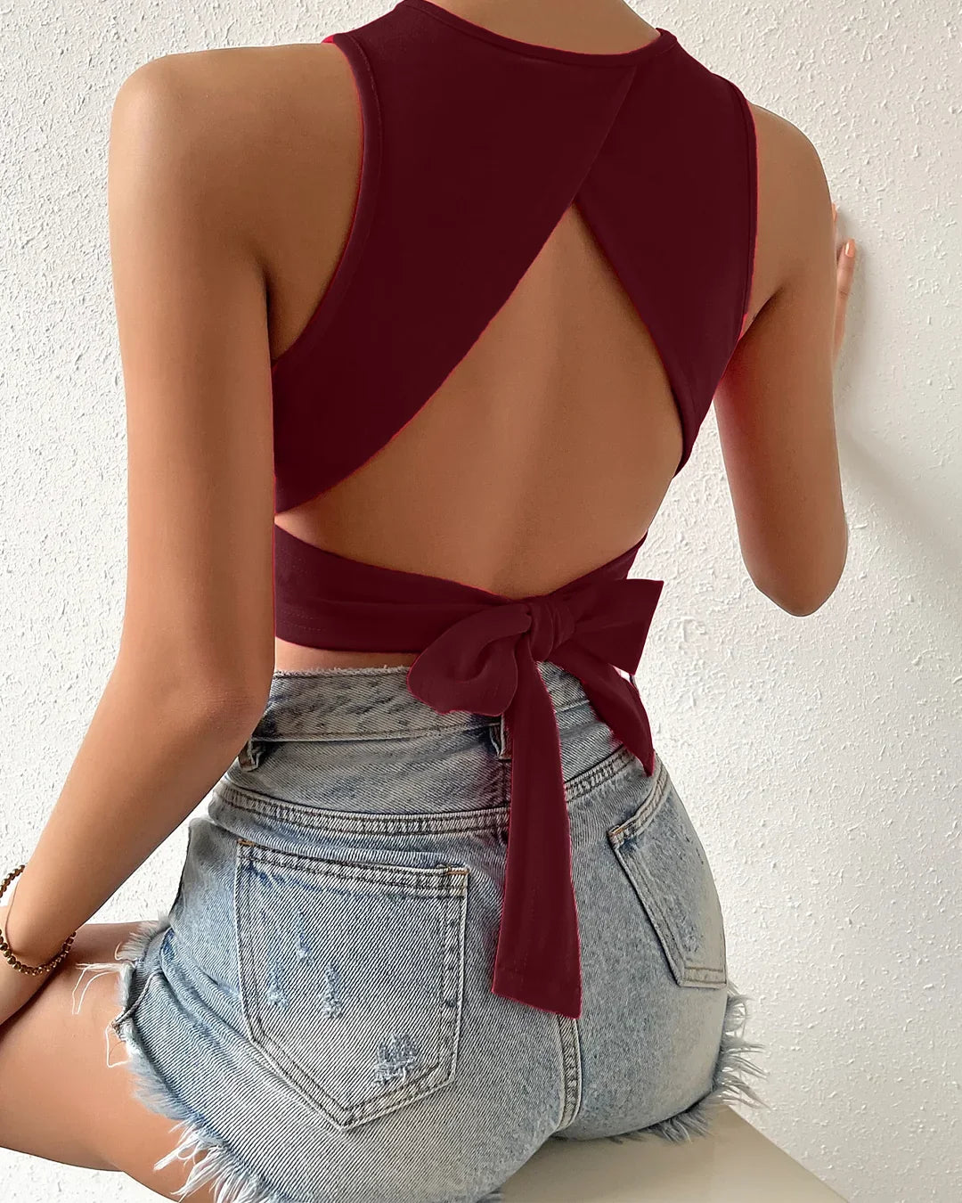 This backless crop tank top is made to turn heads with its clean round neckline and bold open back detail. The slim fit hugs your shape just right, while the straight hem keeps the look sharp and minimal. Crafted in a soft stretch blend, this backless crop tank top feels smooth on the skin and moves with you. The tie detail at the back adds that extra cute touch, giving this backless crop tank top a playful yet confident vibe.