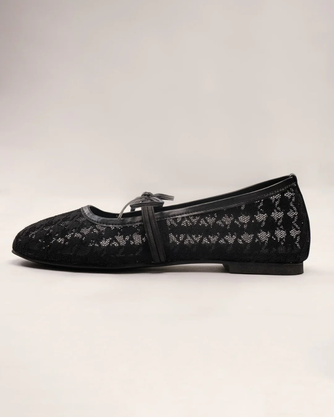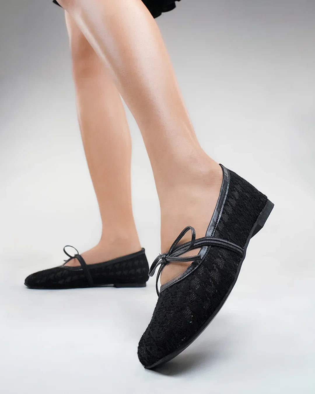 Ballet flats round toe lace casual flats in black are made for easy days with a soft, feminine touch. Designed with a delicate lace-textured upper and a neat bow detail, this pair feels light, airy, and effortlessly stylish. The round toe keeps the look classic, while the cushioned footbed adds comfort for everyday wear. These ballet flats blend minimal design with a clean finish, making them a timeless pick for a relaxed Gen-Z wardrobe.