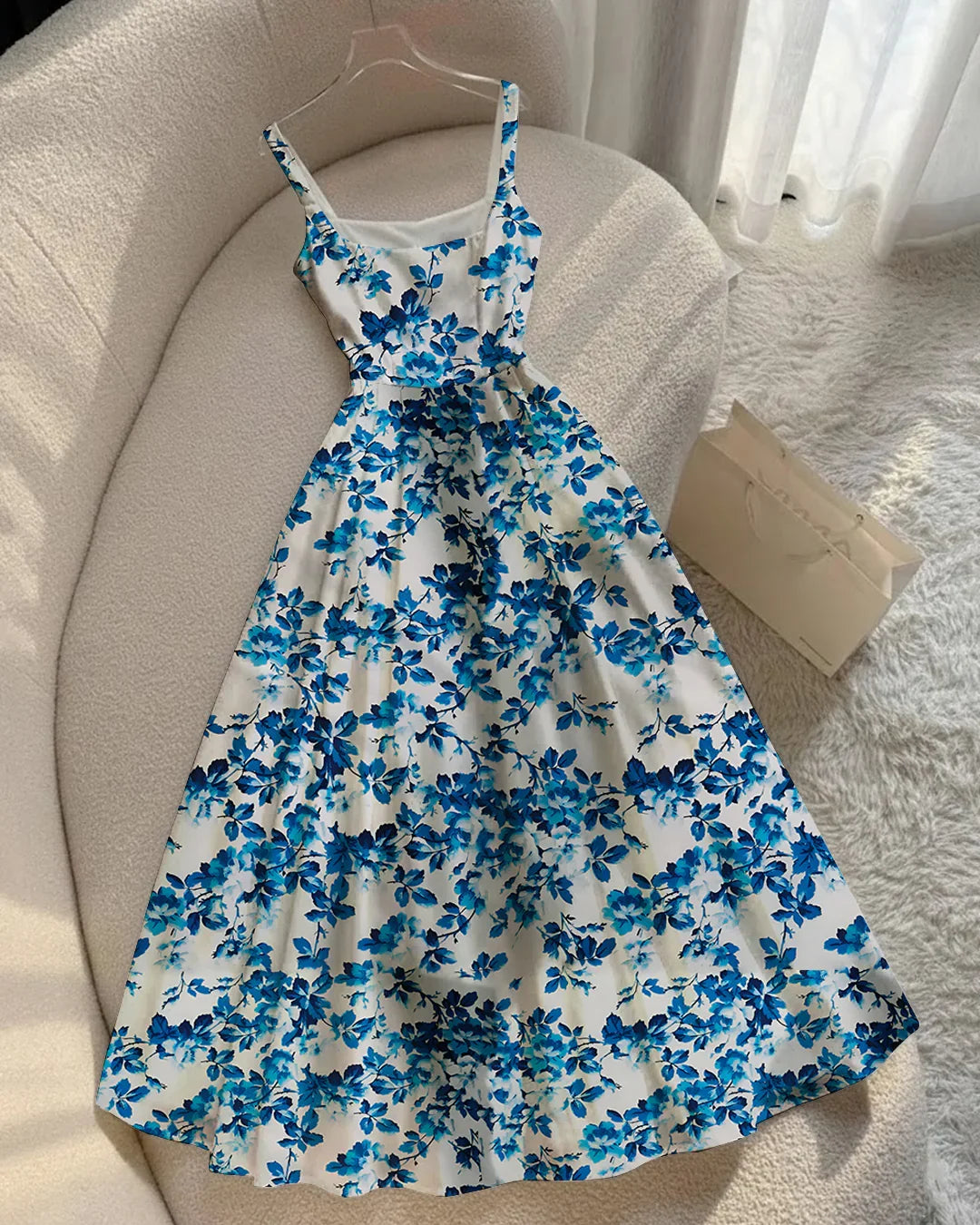 Sleeveless Square Neck Fit & Flare Floral Maxi Dress in White and Blue