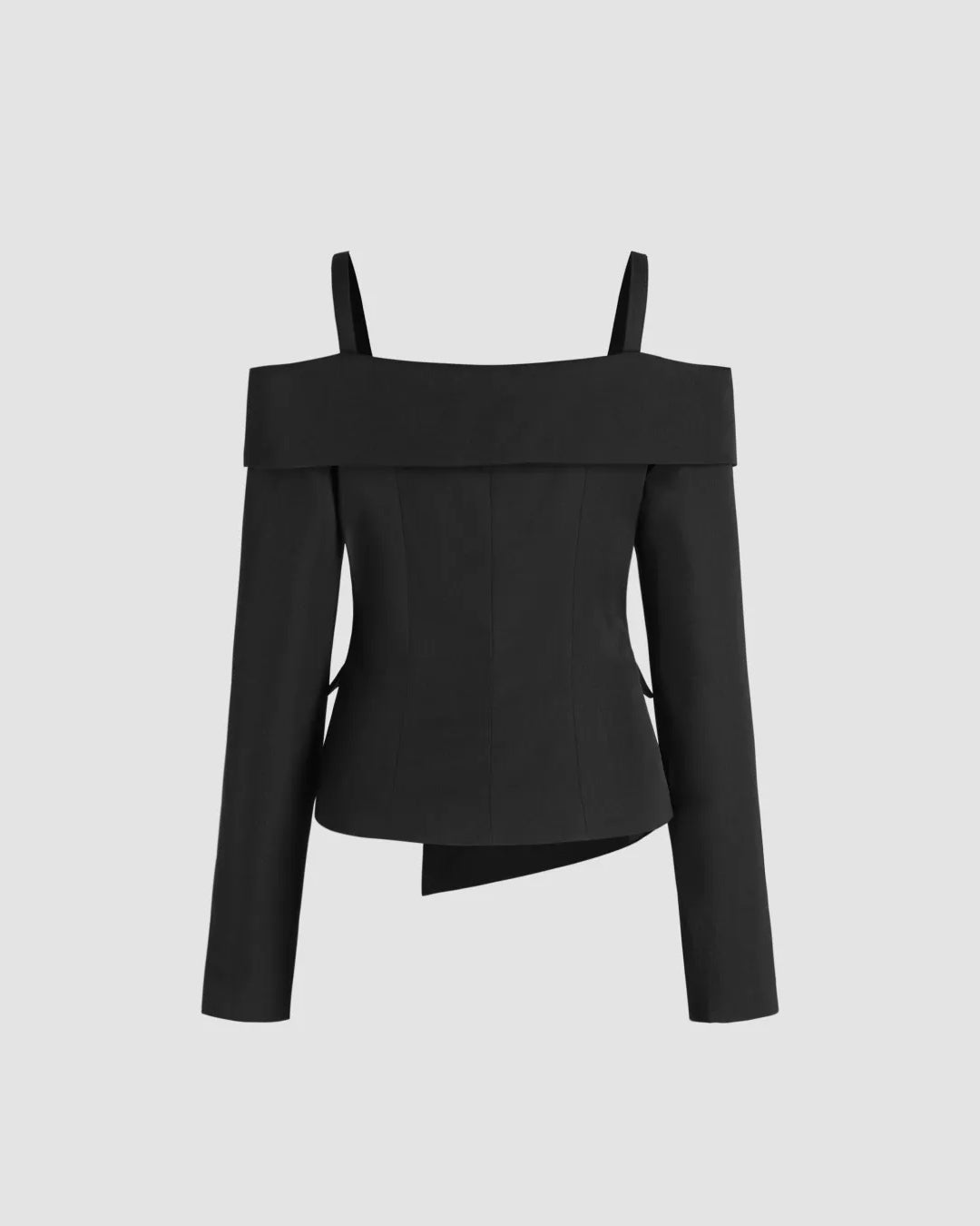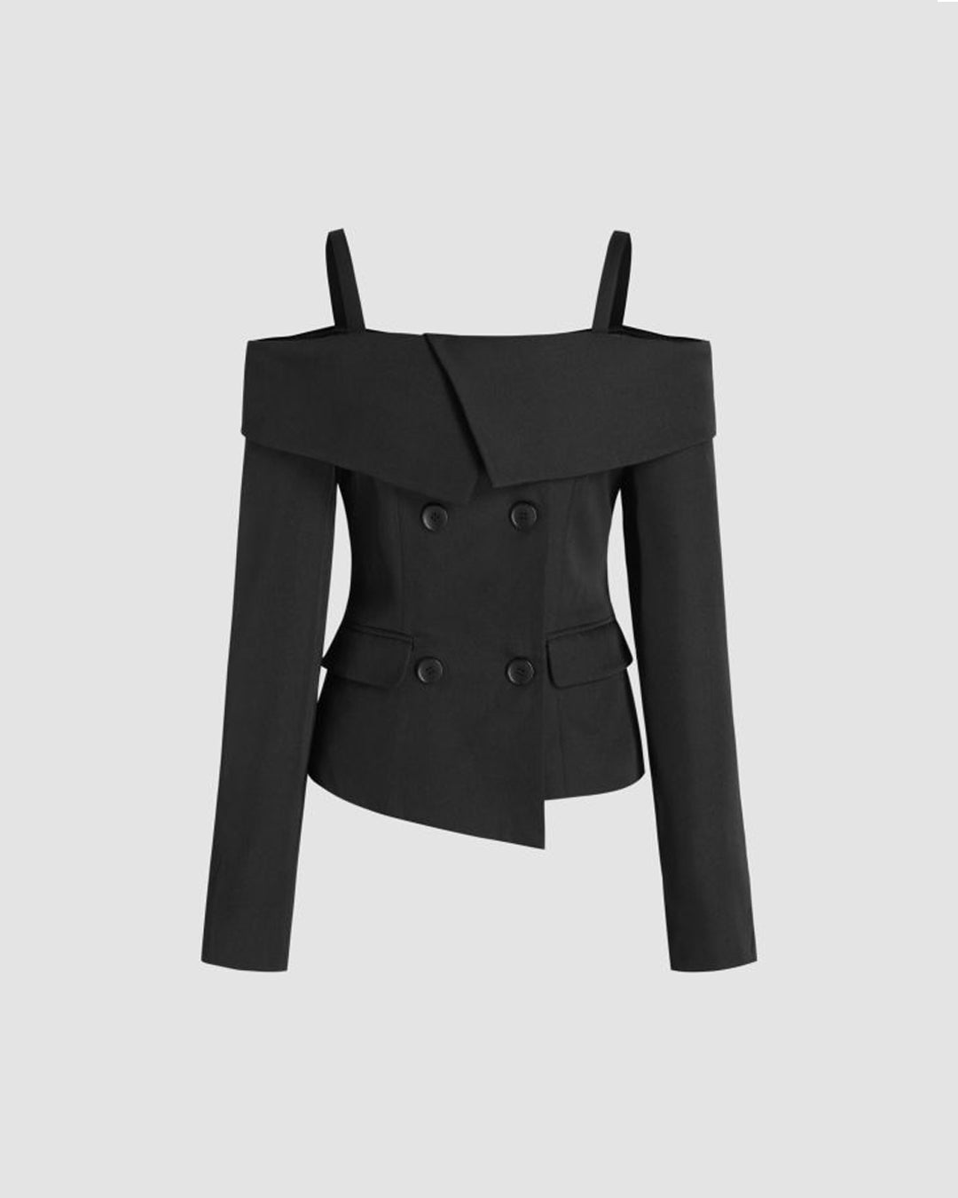 This solid off-shoulder button blazer is where sharp tailoring meets bold styling. Designed with a structured fit and statement off-shoulder neckline, this solid off-shoulder button blazer instantly upgrades your wardrobe. The double button detail adds a classic touch, while the clean straight hem keeps it sleek and modern. Crafted in a smooth stretch blend, it hugs just right without feeling stiff. The black tone makes this solid off-shoulder button blazer a timeless power piece you can wear on repeat.