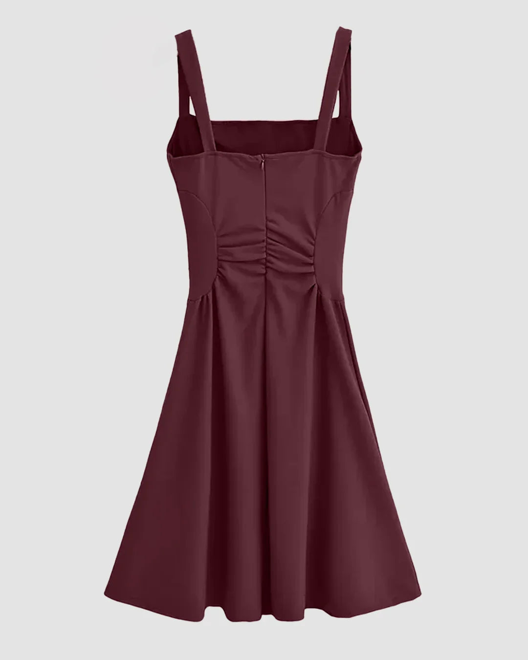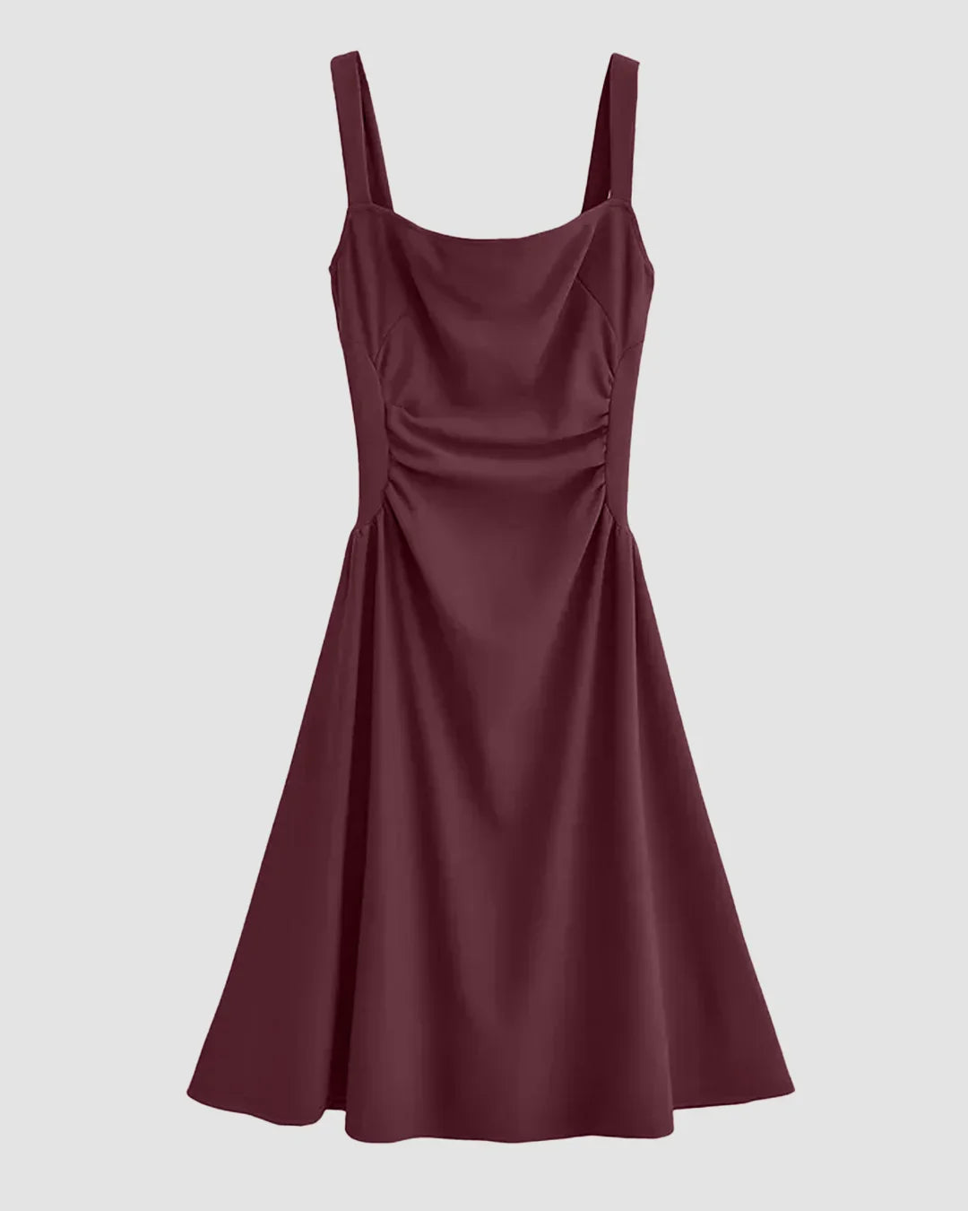 Spaghetti Strap Square-Neck Plain Ruched Midi Dress in Maroon