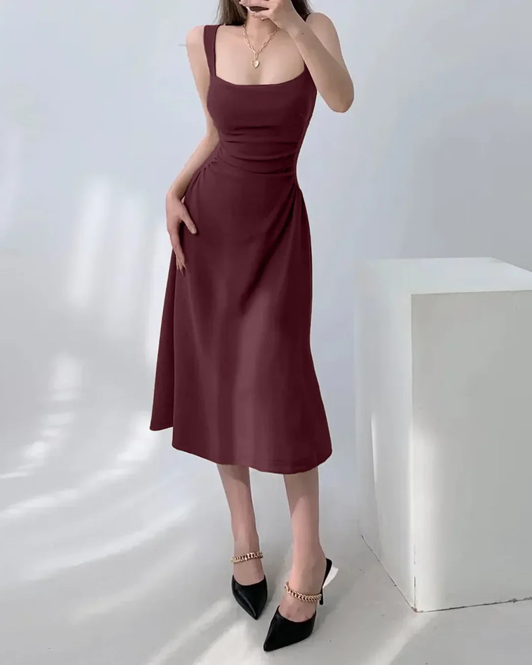 Spaghetti Strap Square-Neck Plain Ruched Midi Dress in Maroon is a clean, elegant piece designed for effortless everyday dressing with a polished finish. The square neckline and slim spaghetti straps create a minimal silhouette, while the subtle ruching at the waist adds gentle shaping without feeling overdone. The midi length keeps the look balanced, making it easy to wear across different occasions.