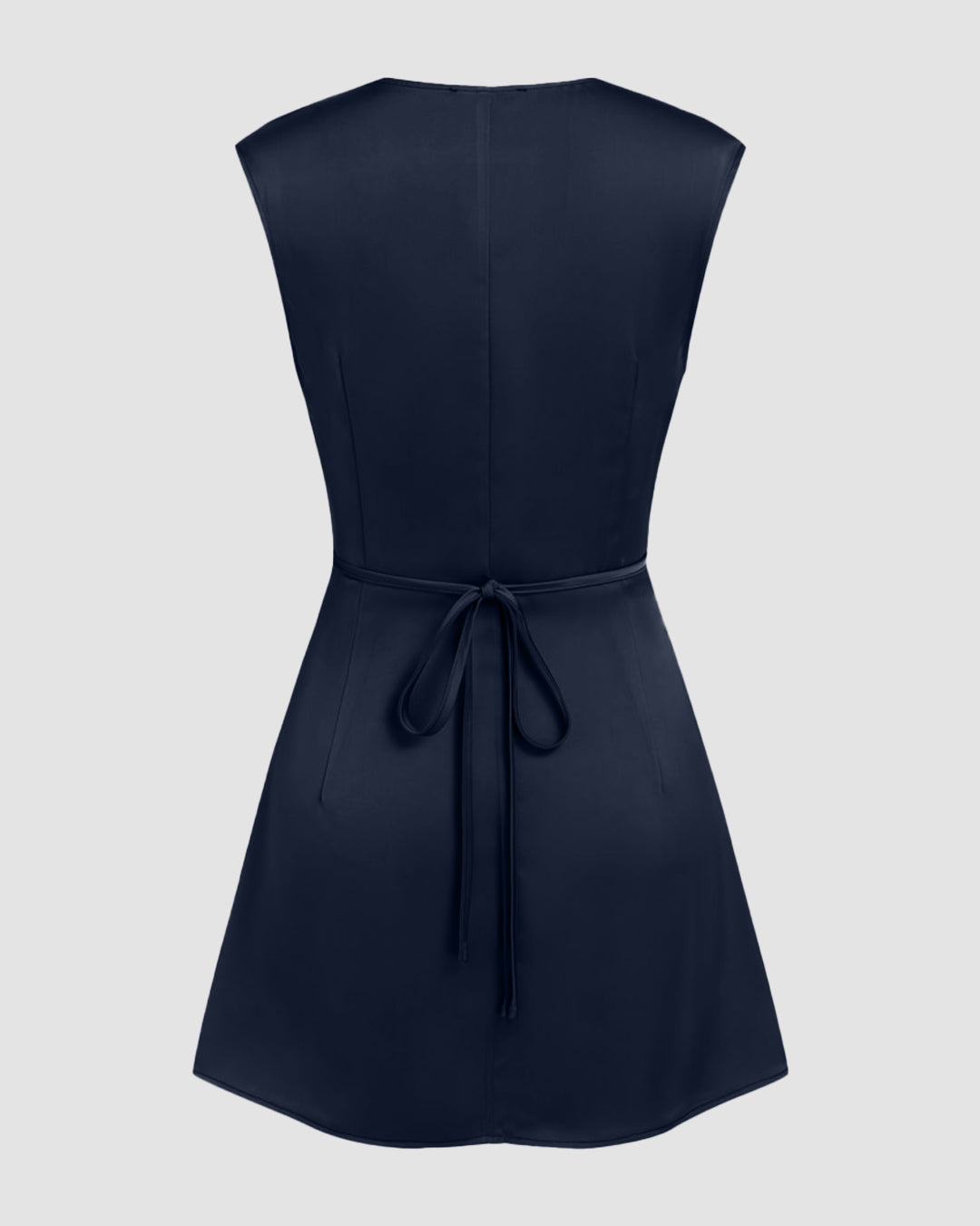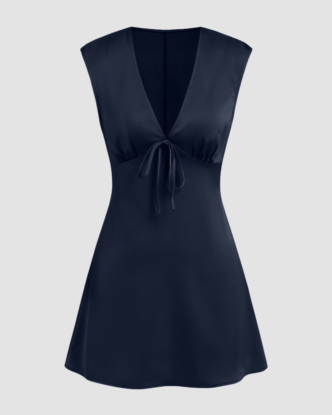 V-neck Ruched Knotted Tie Back Mini Dress in Navy Blue is your go-to for sleek, confident styling. The deep V neckline and soft ruching shape the bodice beautifully, while the knotted tie detail adds a subtle statement touch. Designed in a flattering mini length, this navy blue mini dress hugs in the right places and flows smoothly over the body. The clean silhouette keeps it minimal, and the rich navy tone makes this navy blue mini dress feel polished yet playful. Lightweight polyester fabric ensures this navy blue mini dress feels easy and comfortable all day.