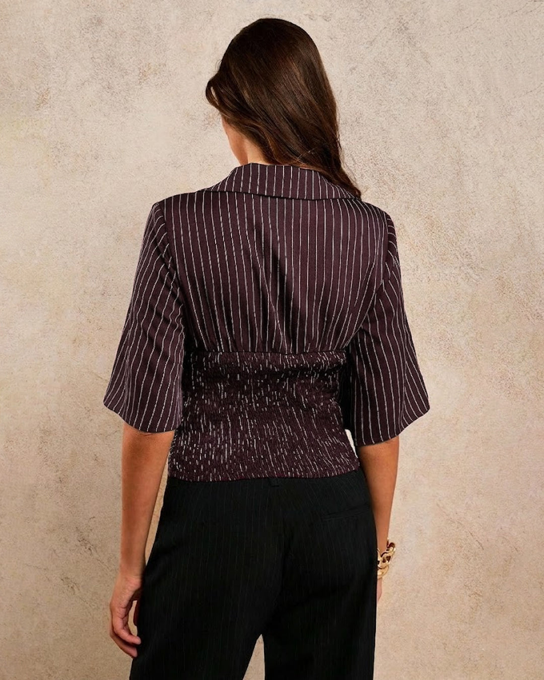 V-Neck Striped Flared Ruched Top in Wine Red blends classic tailoring with a modern fitted shape. This striped ruched top features a flattering V-neckline with a soft collared detail that adds a polished touch. The ruched front creates a sculpted silhouette while the subtle flared sleeves bring balance and movement. Crafted in a polyester, viscose, and twill blend, this striped ruched top feels smooth, breathable, and comfortable for everyday wear. The wine tone with fine stripes keeps the look refined yet stylish.