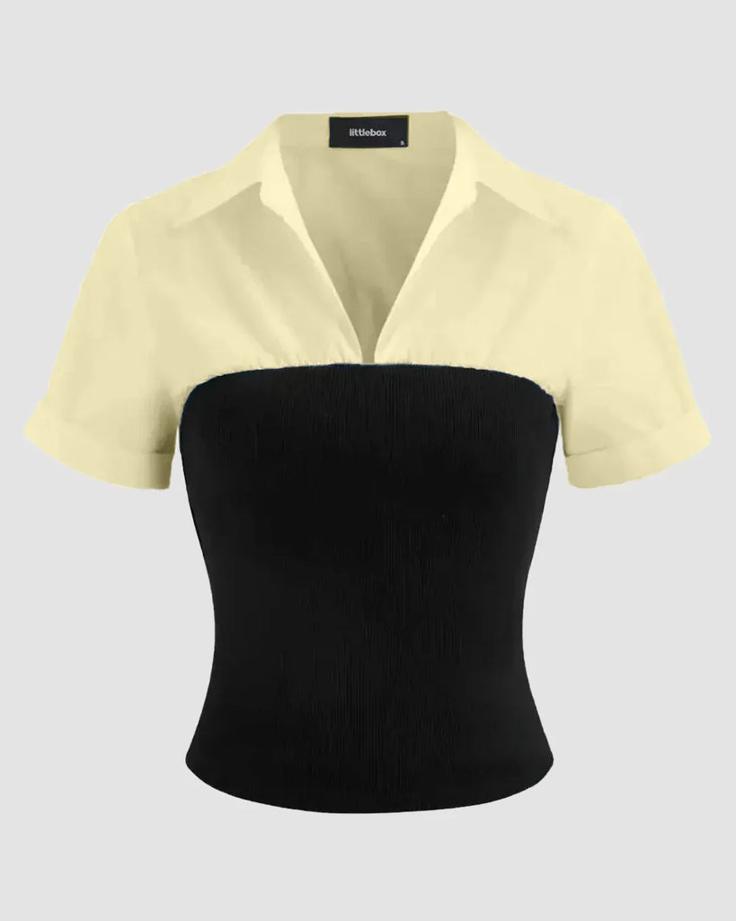 Collar Two Tone Patchy Short Sleeve Shirt In Vanilla and Black