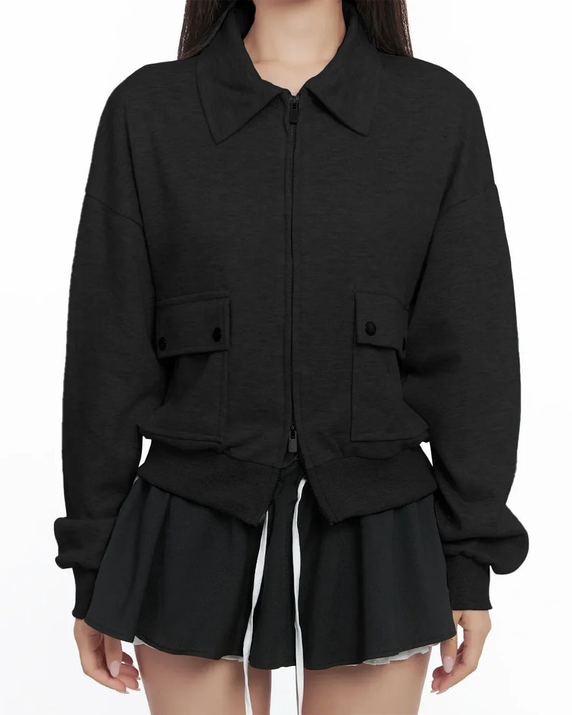 Black Zip Up Collar Long Sleeve Jacket with Front Pockets