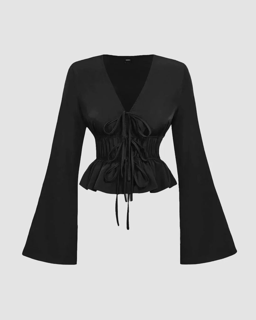 Solid Color Textured Heart Neck Flare Sleeve Casual Long Sleeve Top In Black