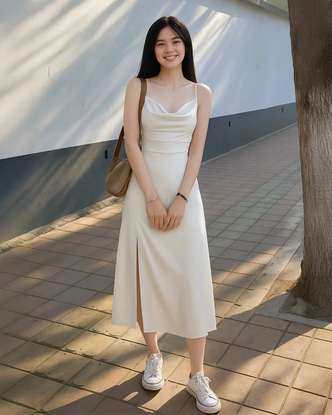 - Casual Look : Pair this cowl neck midi dress with flat sandals, a sling bag, and a sleek low bun.