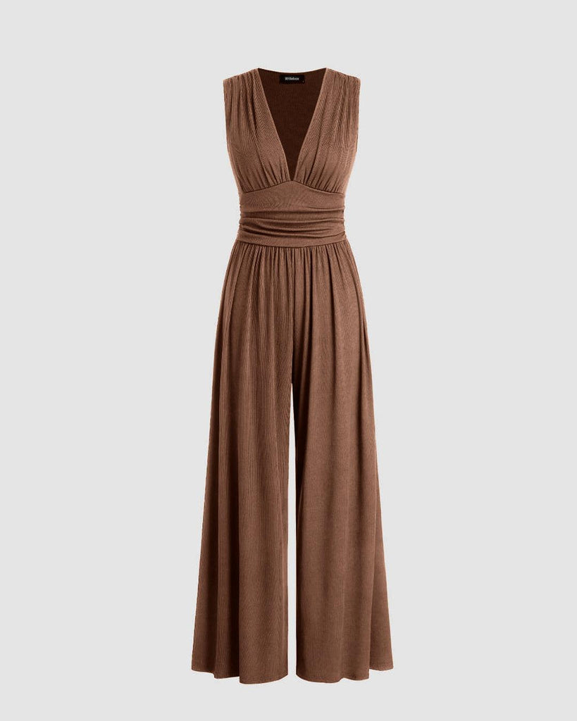 V-Neck Tie Back Wide Leg Brown Jumpsuit