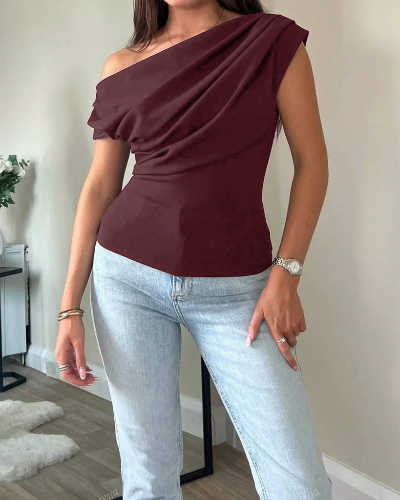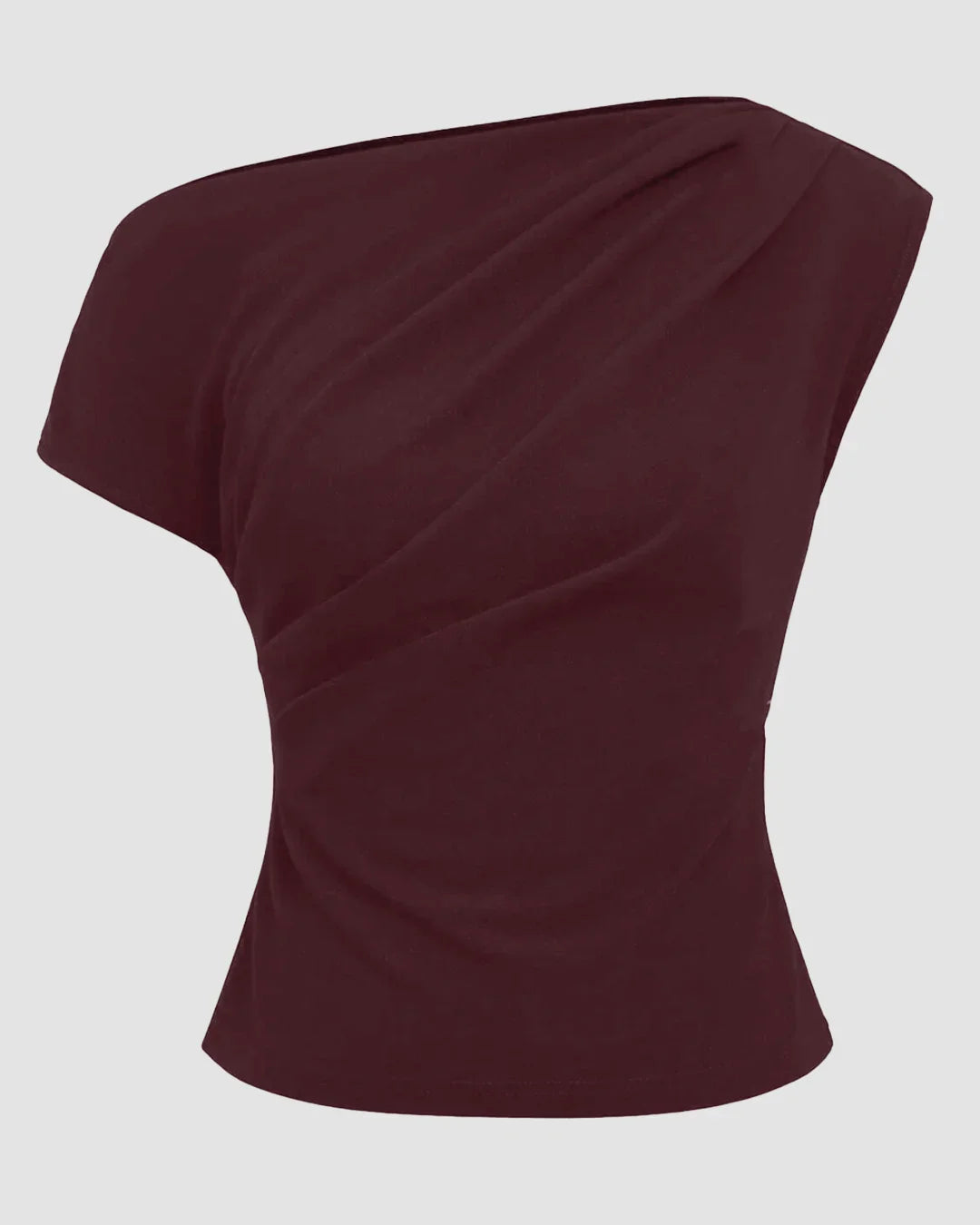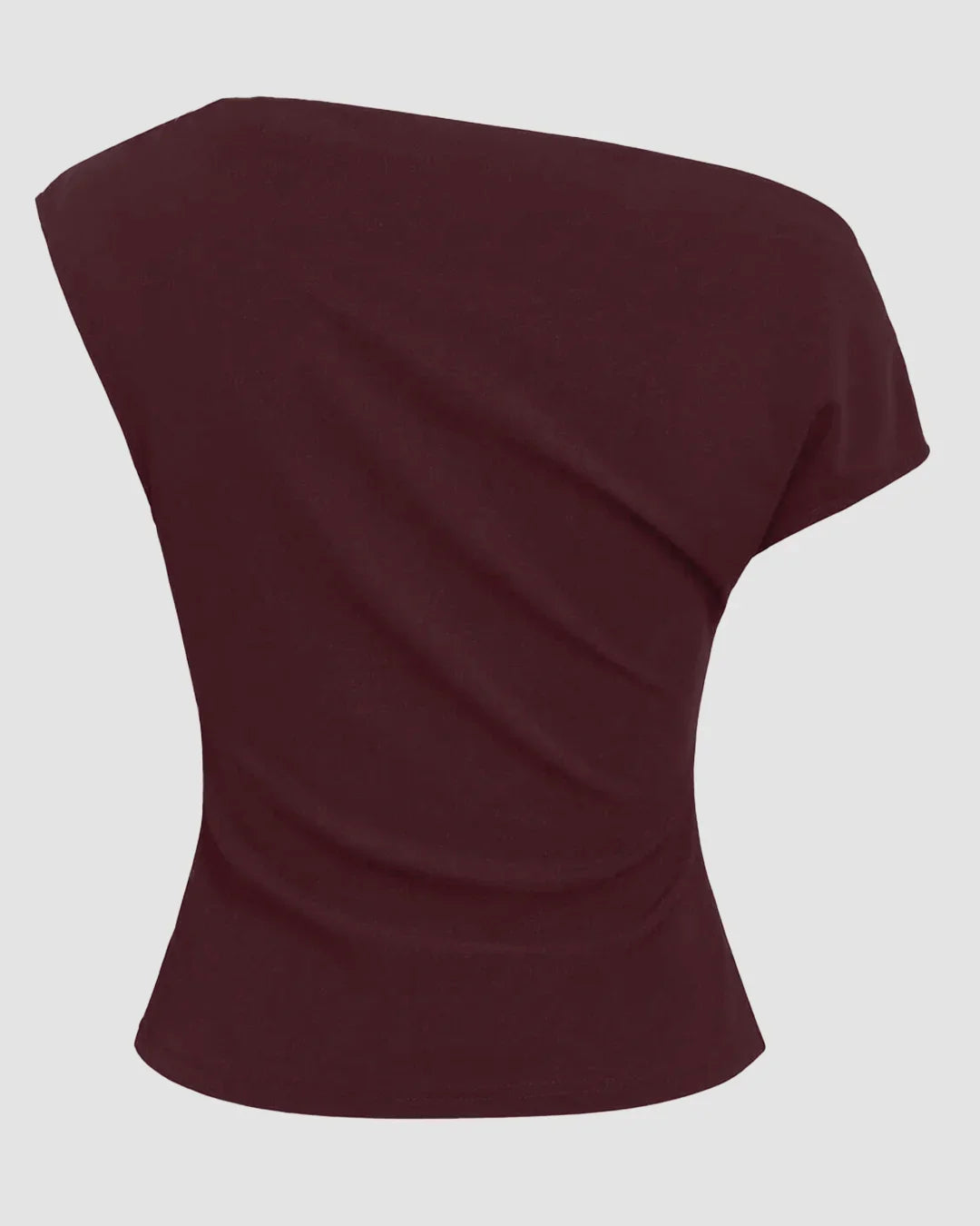 This one shoulder top is designed to bring a modern edge to your wardrobe. With its asymmetrical neckline and soft draped detailing, it creates a bold yet sophisticated look. The rich maroon color adds depth and elegance, making this one shoulder top a striking choice for both casual and dressy plans.