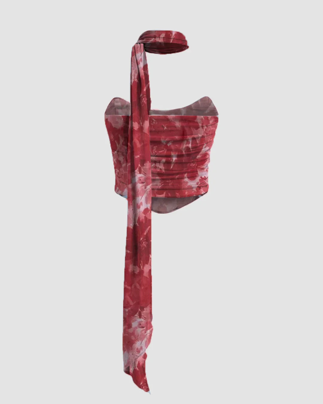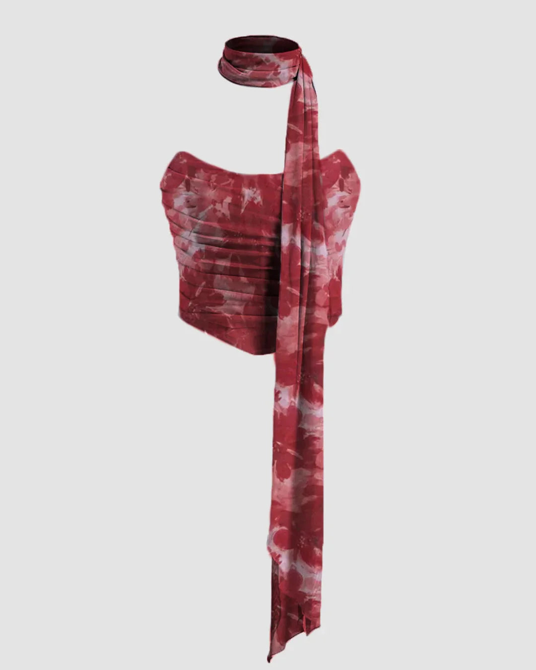 This red colour top brings bold floral energy with a sleek strapless silhouette. Designed with a wrap front detail, it creates a flattering shape that highlights the waist. The soft ruching adds texture, while the long matching scarf detail gives it a statement finish. This red colour top blends playful and confident vibes effortlessly. The cropped length keeps this red colour top trendy and perfect for standout styling.