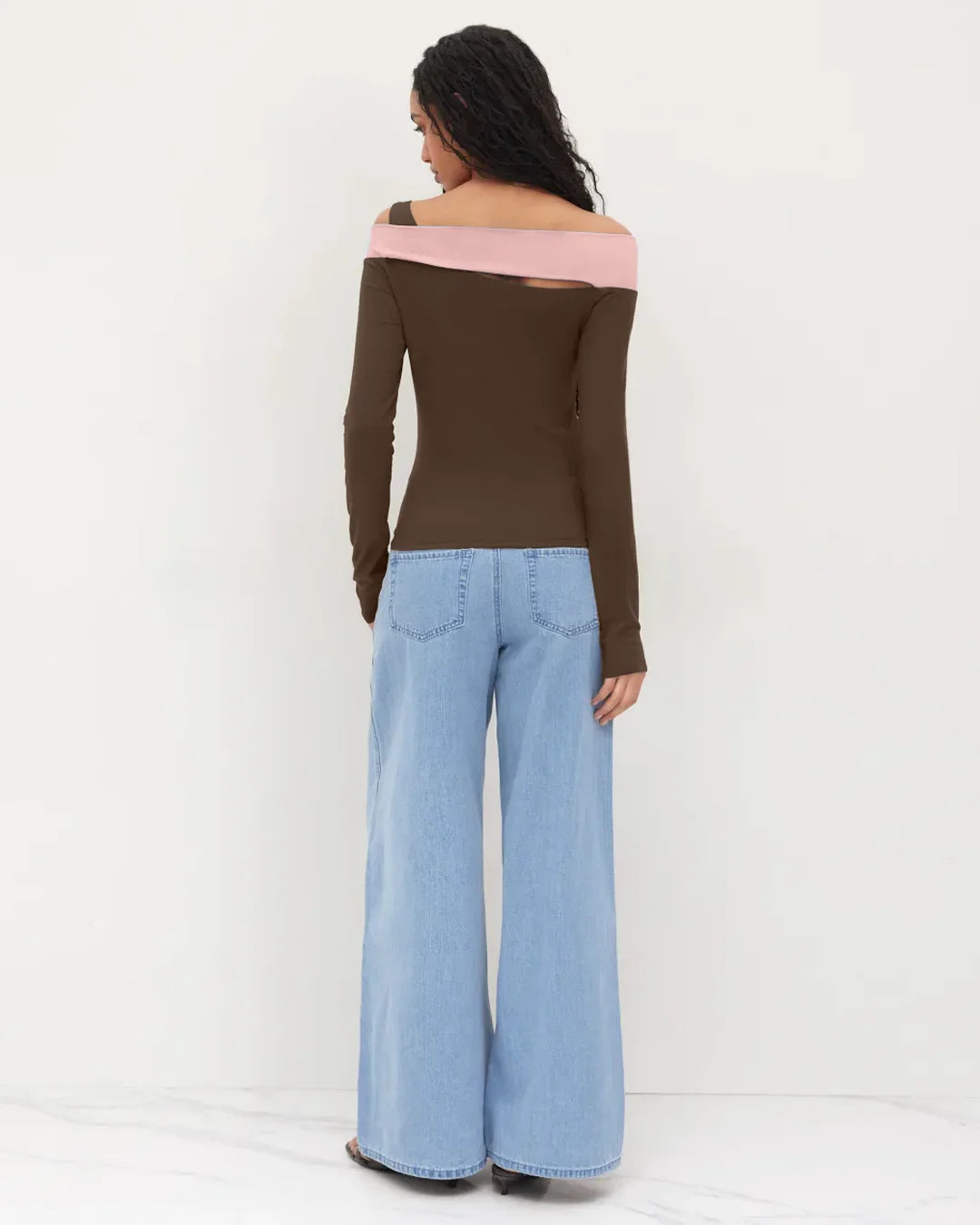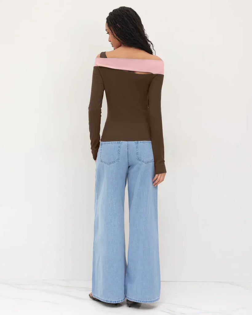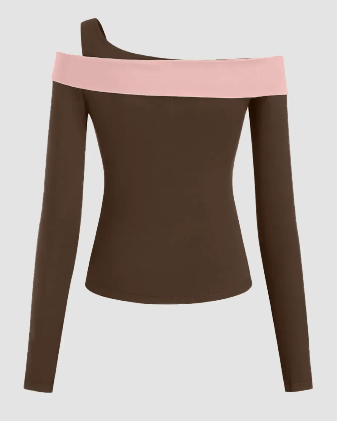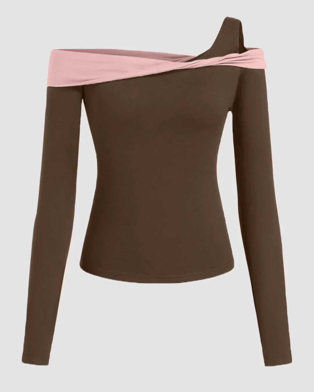Rose and Brown Color block Off Shoulder Full Sleeve Top