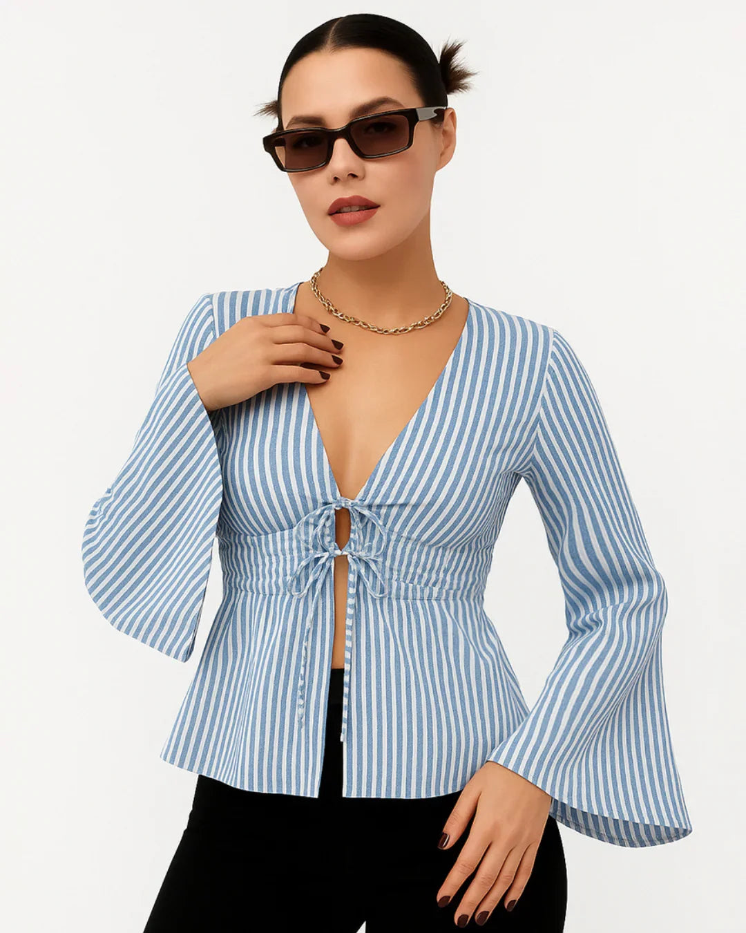 V-neck Striped Knotted Shirred Long Sleeve Top is a chic update for your casual rotation. Designed with vertical stripes, a deep v-neckline, and a knotted tie front, it blends effortless charm with everyday ease. The shirred waist and flared sleeves give this piece a flattering shape, making it stand out among long sleeve tops.