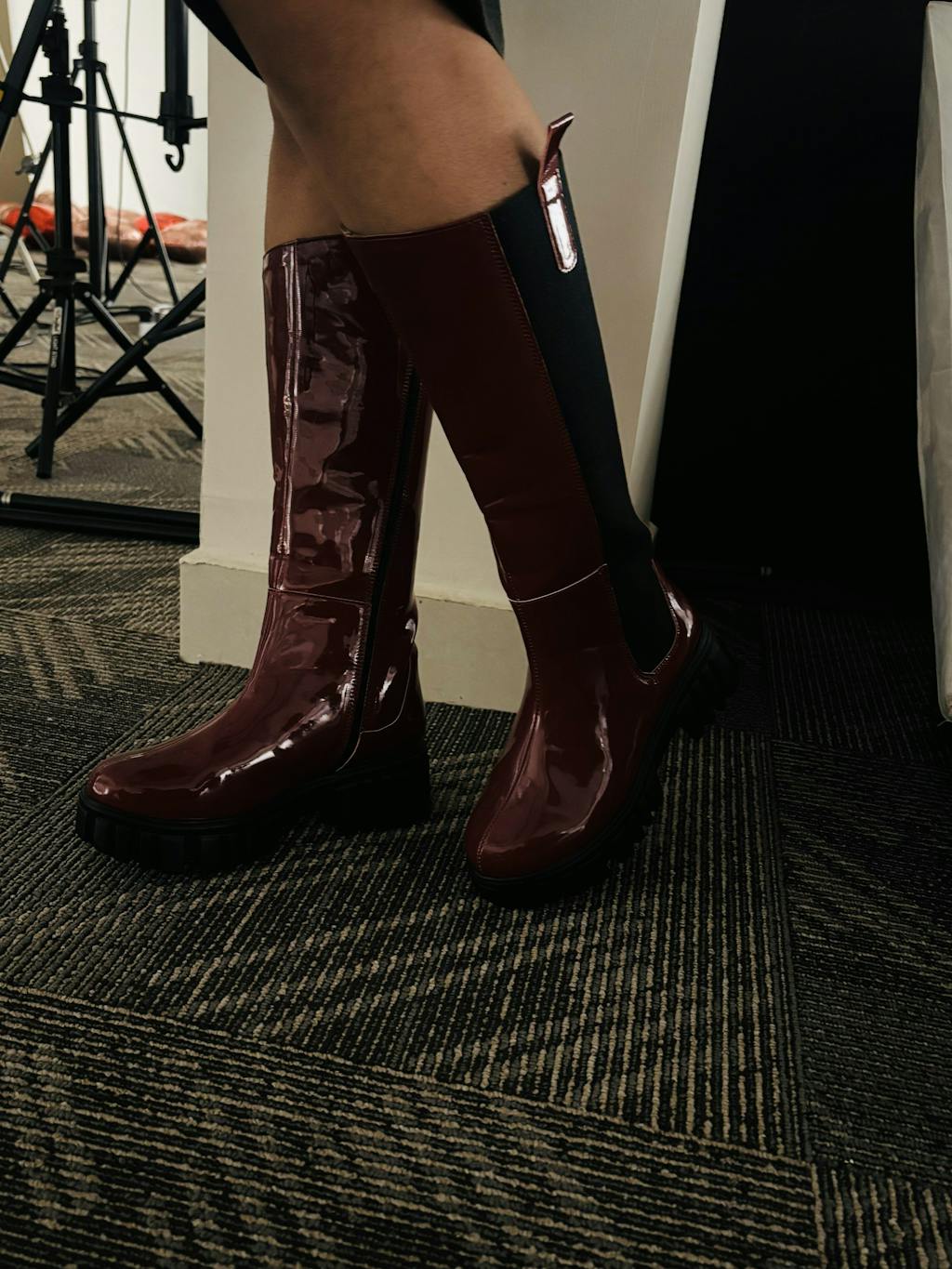 Burgundy Patent Slip-On Mid Calf Pull On Riding Boots bring bold polish with a statement making silhouette. Designed in a rich burgundy patent finish with a glossy shine, these maroon riding boots feel confident, edgy, and instantly eye catching. The mid calf height gives a structured look, while the elastic side panel makes them easy to slip on and off. With a chunky sole and strong build, these maroon riding boots balance classic riding style with a modern, fashion forward edge. The shine adds drama without feeling overdone.