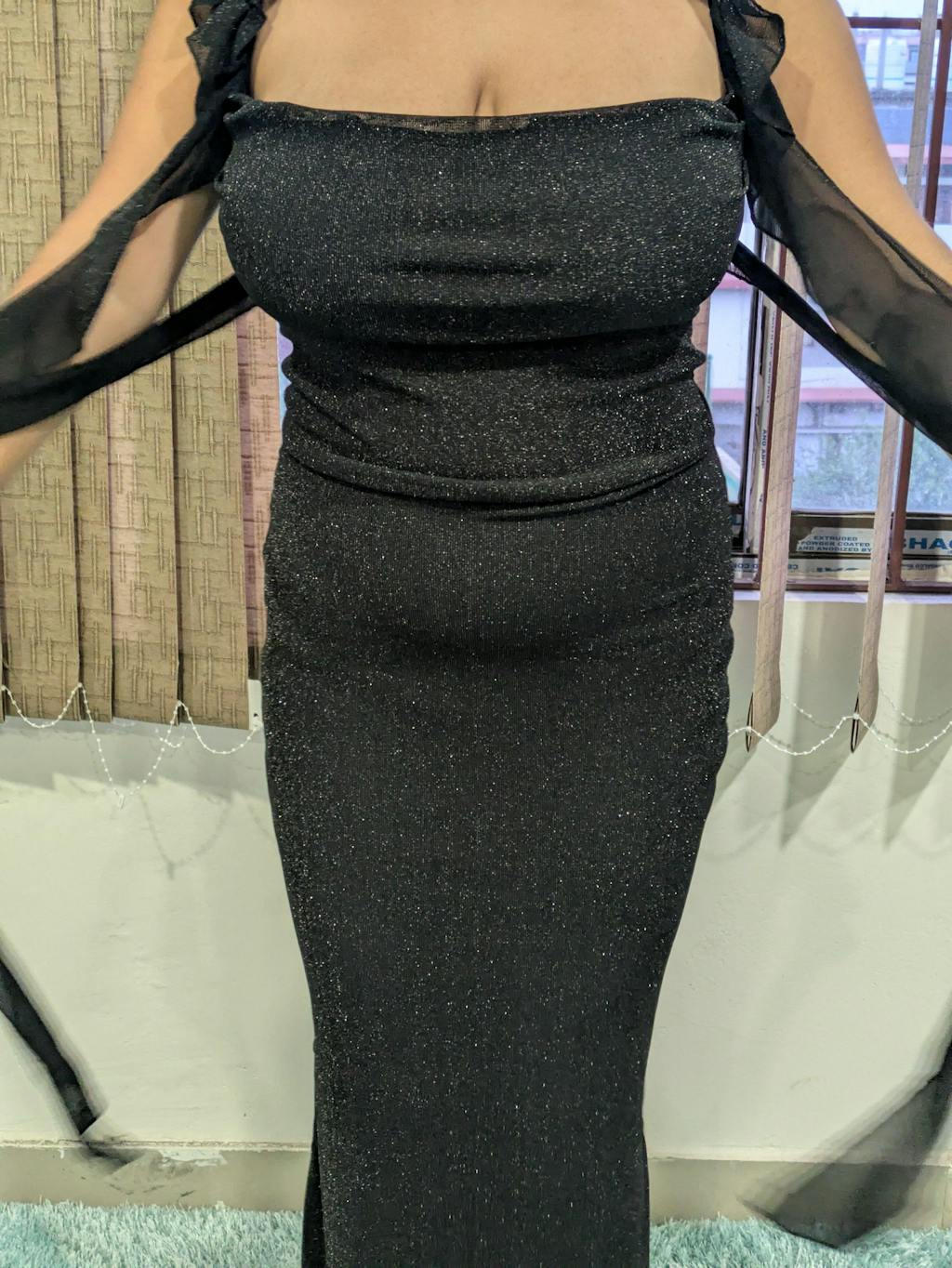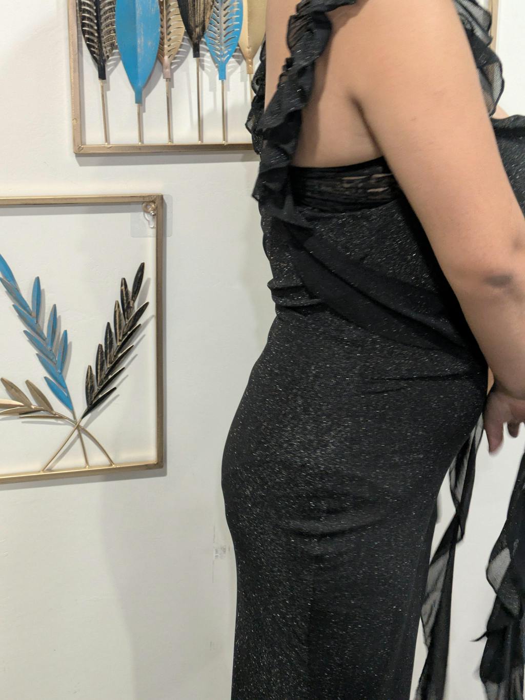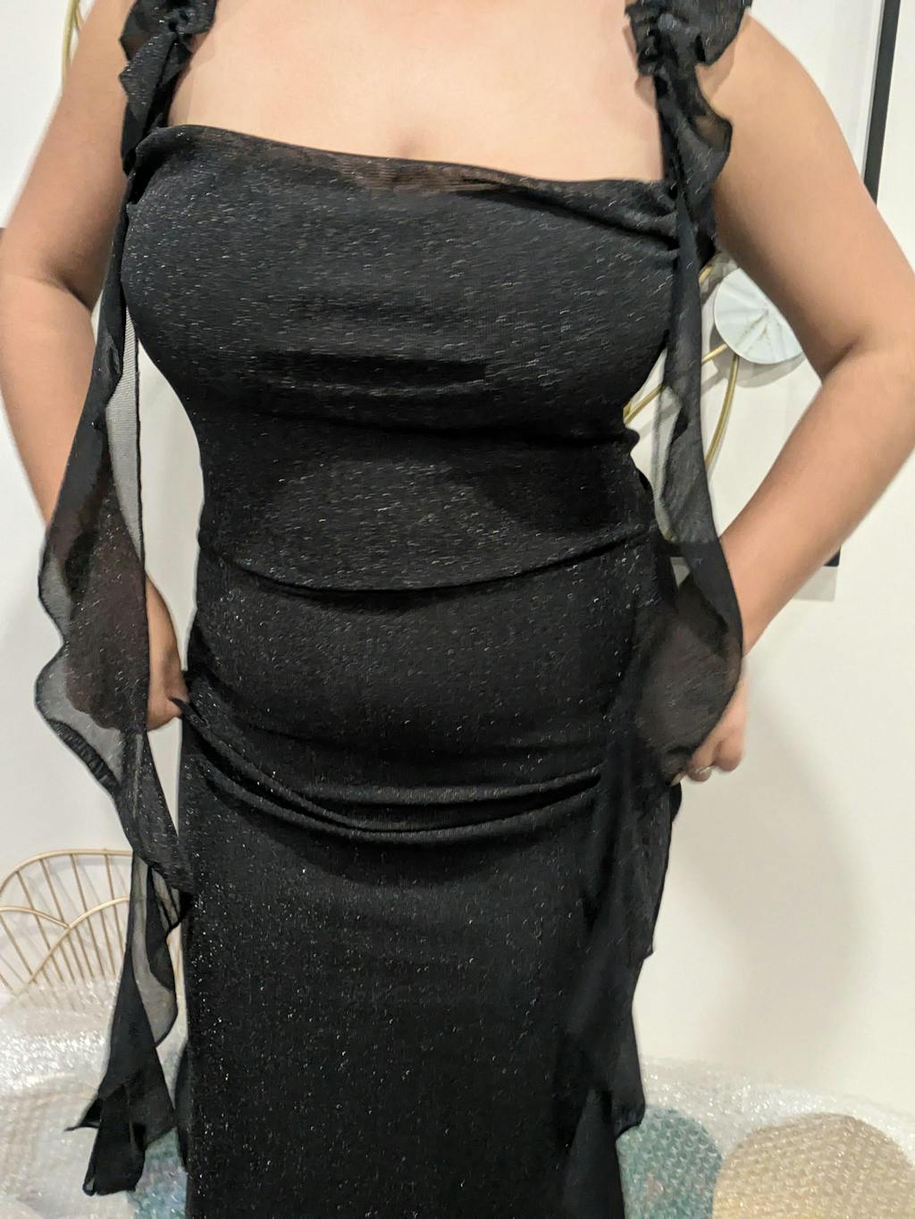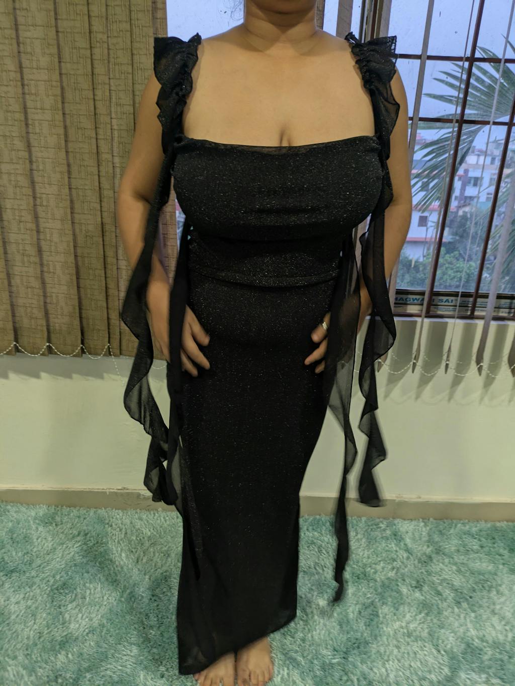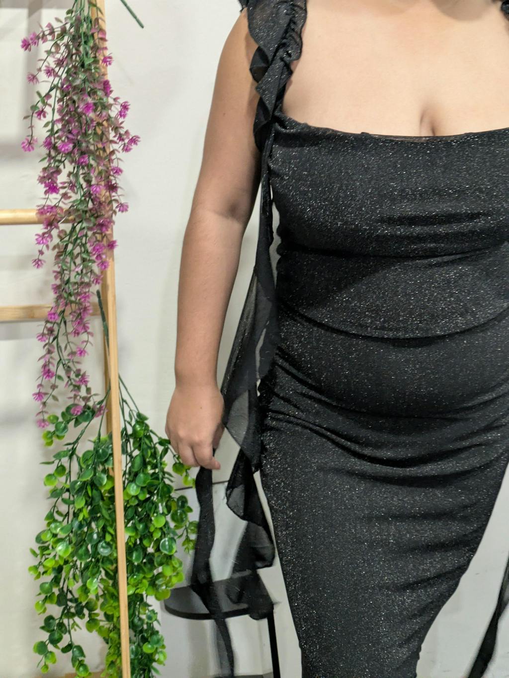 This black midi dress brings effortless elegance with its ruched fit and cascading mesh ruffles. The curve-hugging silhouette creates a sleek, flattering shape, while the shimmer detail adds just enough glam for a standout look. Lightweight and sleeveless, it feels soft against the skin and moves easily, making it your go-to pick for nights that call for something bold yet comfortable.