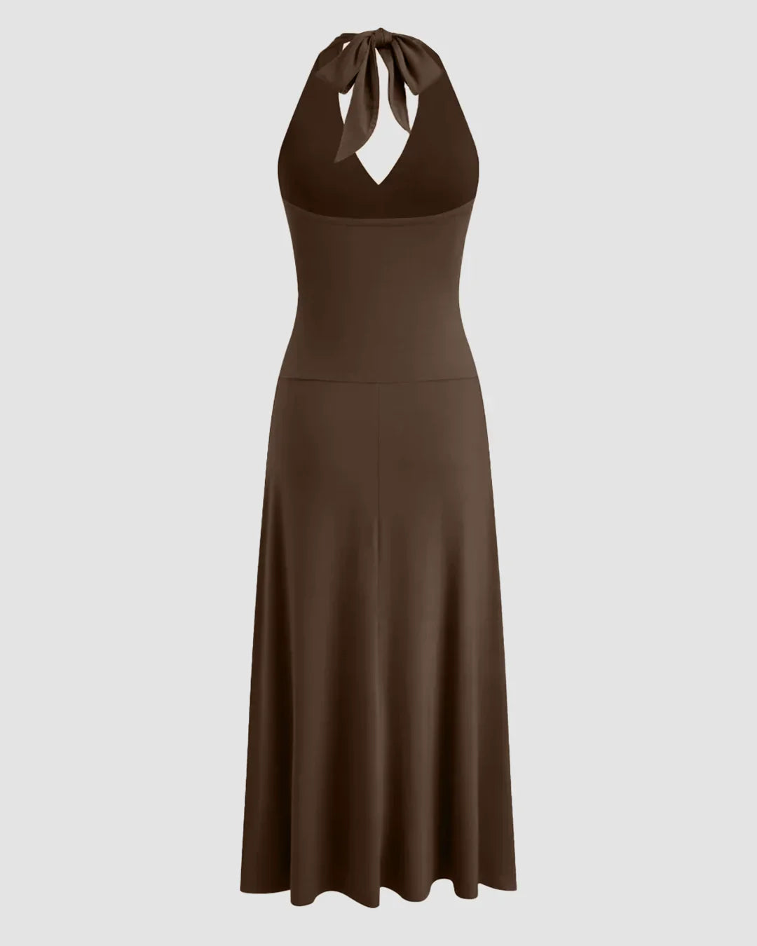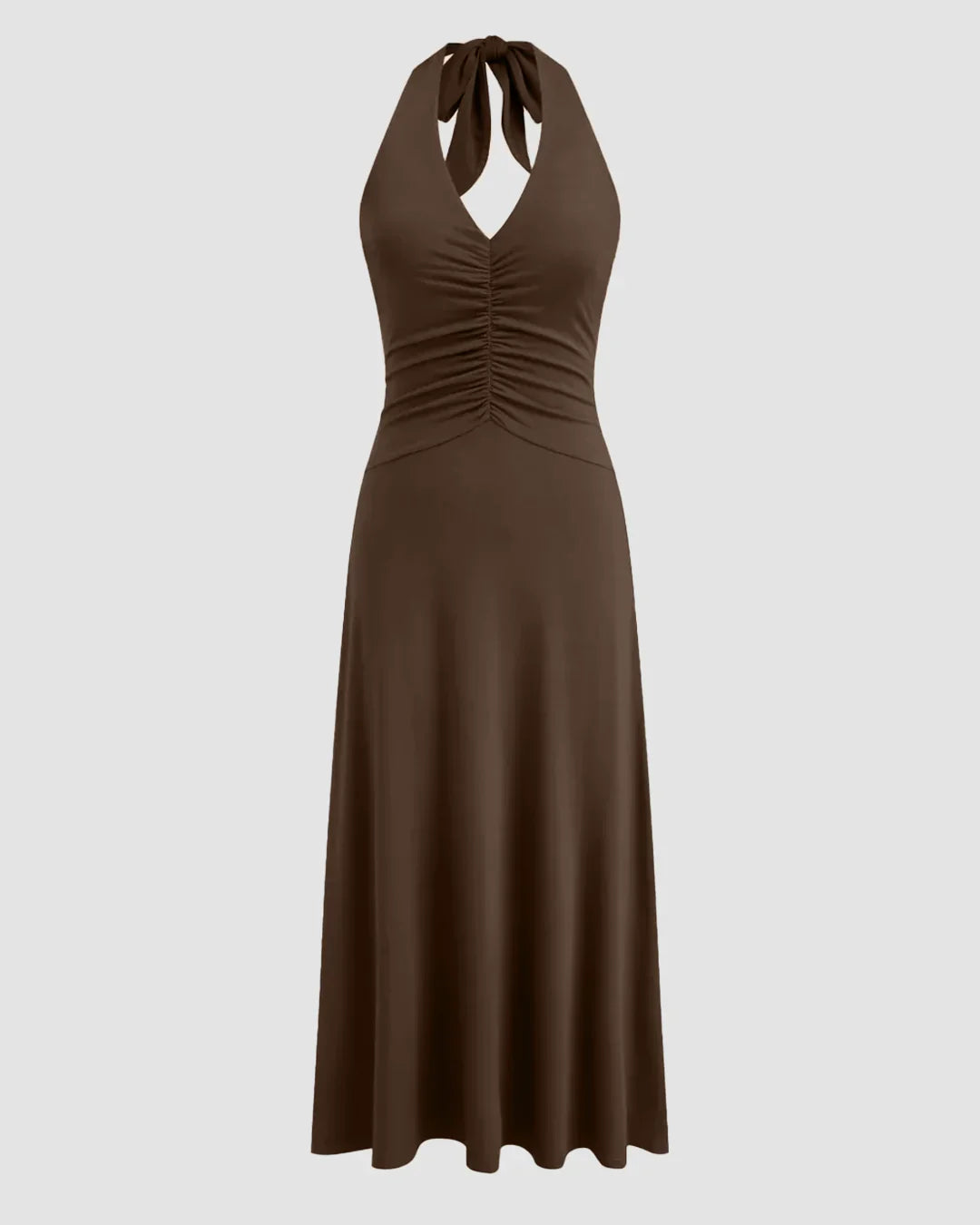 Brown Halter Neck Backless Ruched Waist Midi Dress