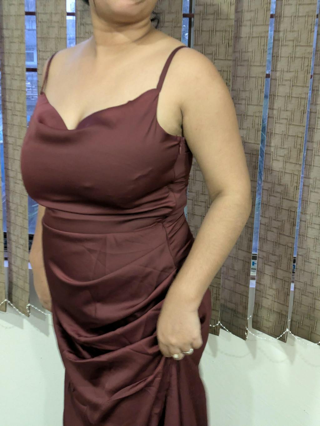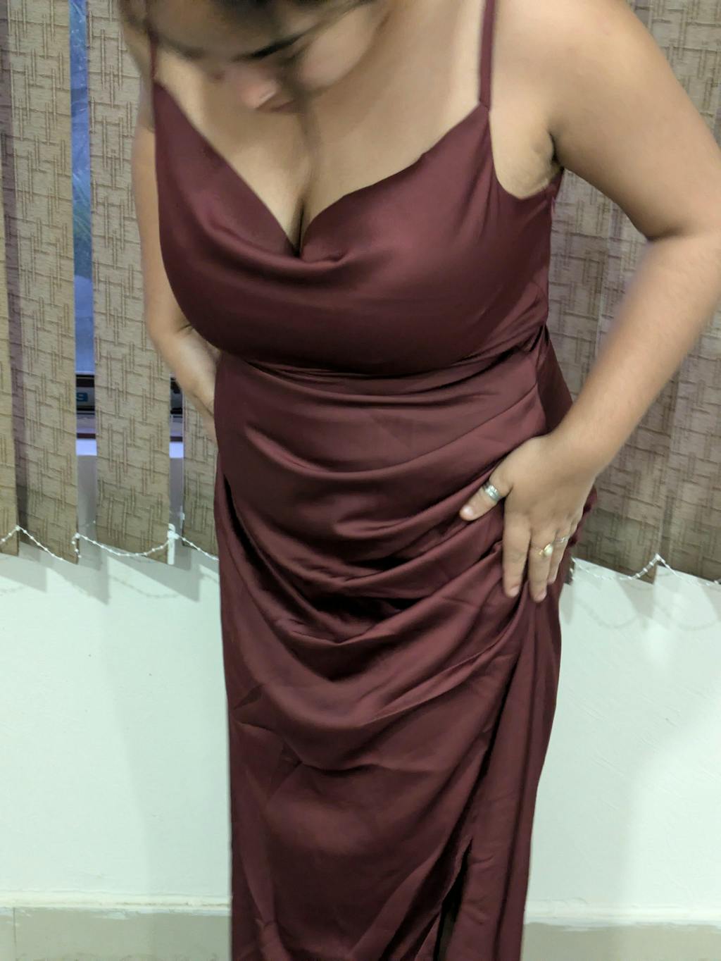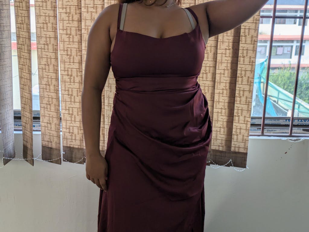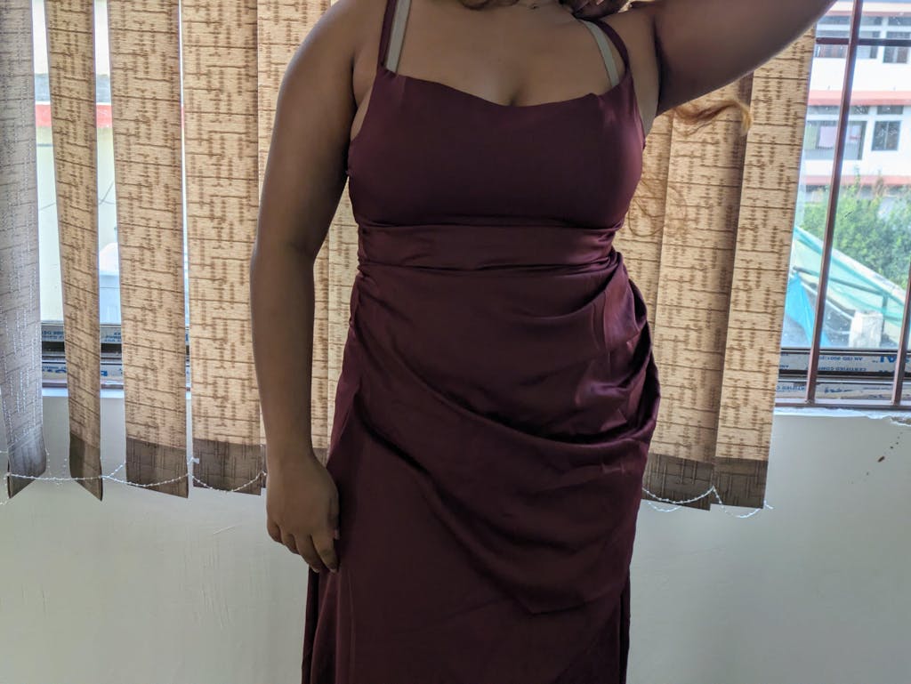 This cowl neck maxi dress brings a smooth, elegant look with a soft draped finish. Designed with delicate shoulder straps and a flattering cowl neckline, it creates a relaxed yet polished silhouette. The fitted waist flows into a sleek maxi length, giving the dress a clean and graceful shape. The maroon colour adds richness and depth, making it feel dressy without being overdone. Crafted in satin-finish fabric, it has a subtle sheen that elevates the overall look.
