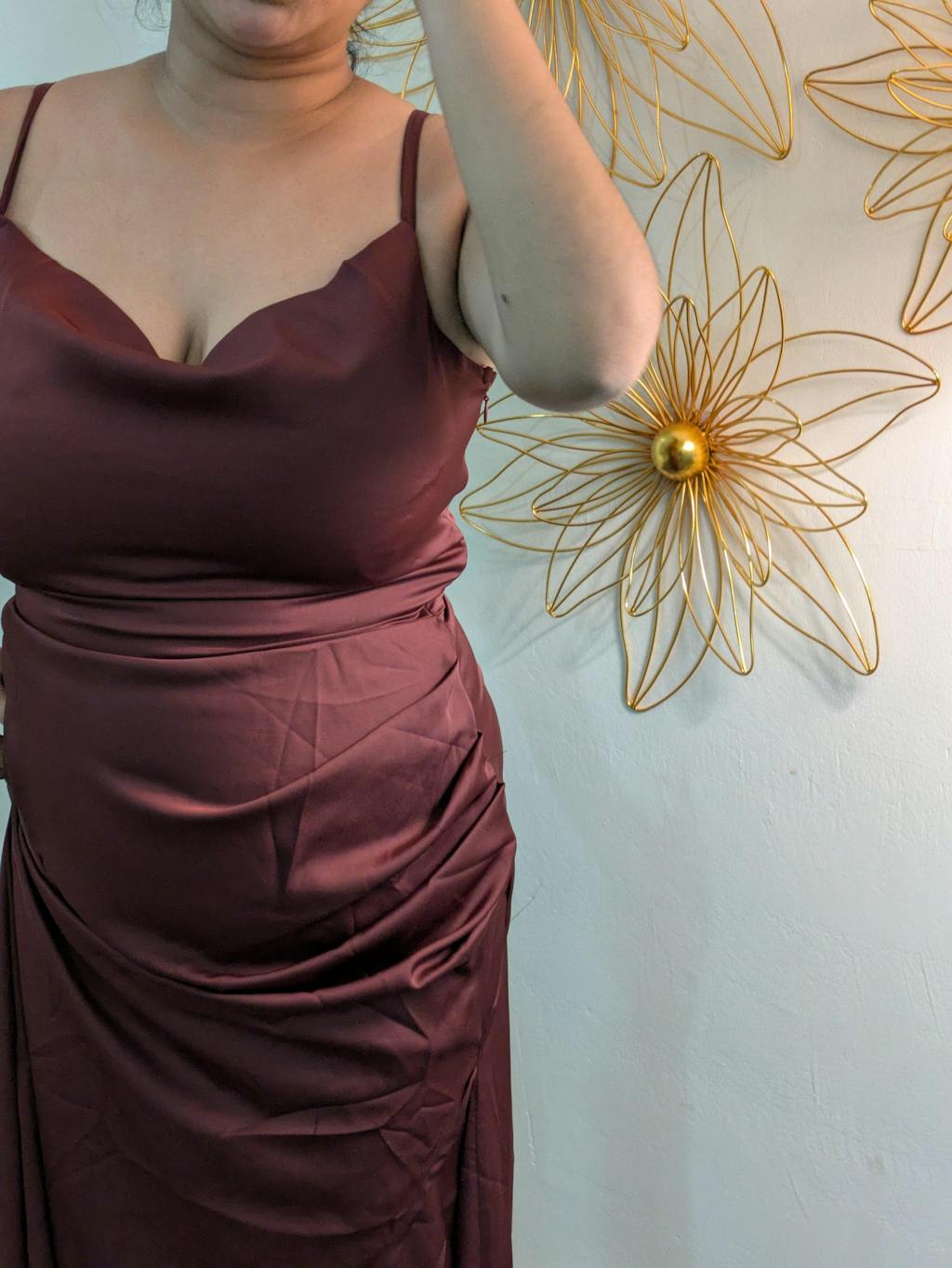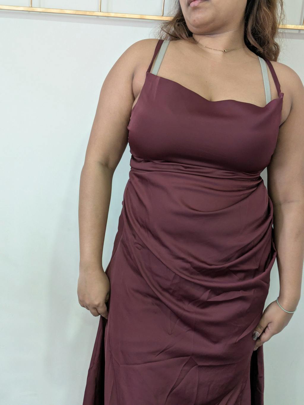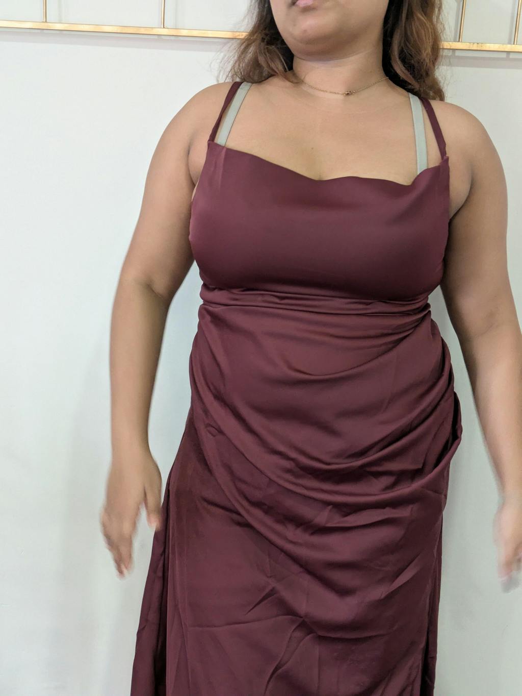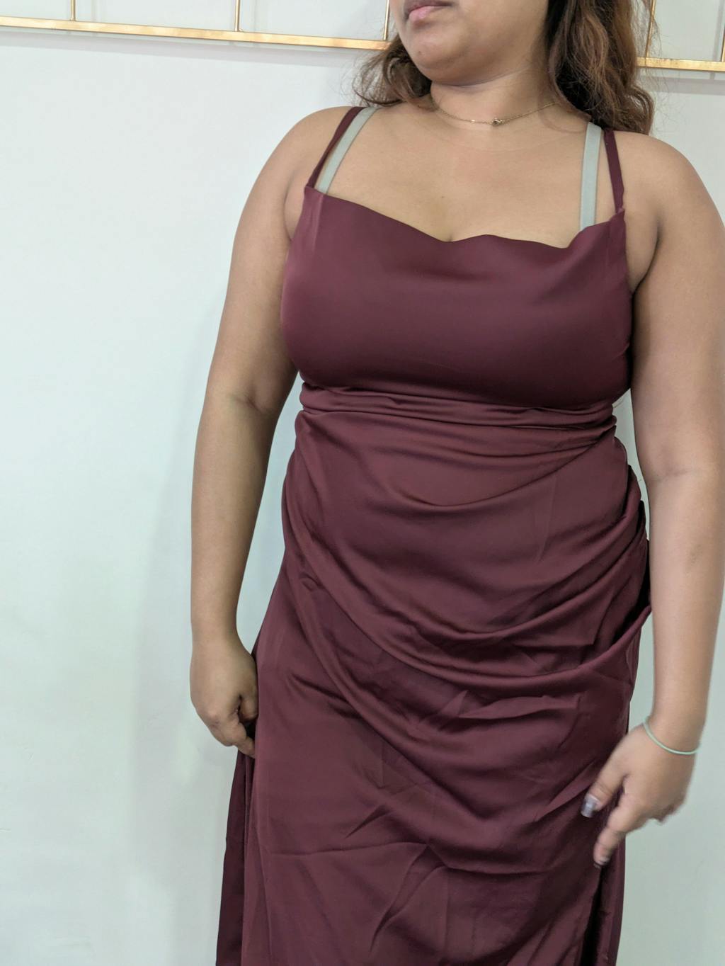 This cowl neck maxi dress brings a smooth, elegant look with a soft draped finish. Designed with delicate shoulder straps and a flattering cowl neckline, it creates a relaxed yet polished silhouette. The fitted waist flows into a sleek maxi length, giving the dress a clean and graceful shape. The maroon colour adds richness and depth, making it feel dressy without being overdone. Crafted in satin-finish fabric, it has a subtle sheen that elevates the overall look.