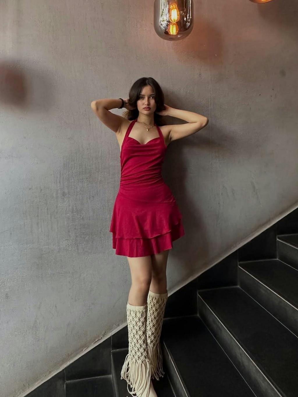 This halter neck mini dress is designed to stand out with its rich maroon tone and flattering fit. The halter neckline highlights the shoulders, while the softly ruched waist adds shape without feeling restrictive. The layered ruffle hem gives the halter neck mini dress a playful finish that moves beautifully with every step. Crafted in a smooth, slightly stretch fabric, it feels light, polished, and easy to wear.