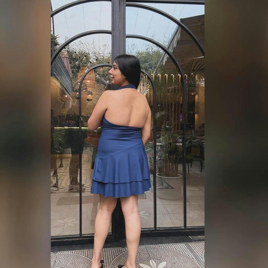 This womens skater dress brings a clean, flattering shape with an easy flow that feels light and effortless. Designed with a fitted upper and a softly flared skirt, it creates a balanced silhouette that sits well on the body. The halter neckline adds a modern touch, while the navy blue shade keeps it sleek and versatile. Made with a stretch-blend fabric, this womens skater dress feels smooth on the skin and moves comfortably with you. The layered hem gives subtle volume without feeling heavy, keeping the look fresh and playful.